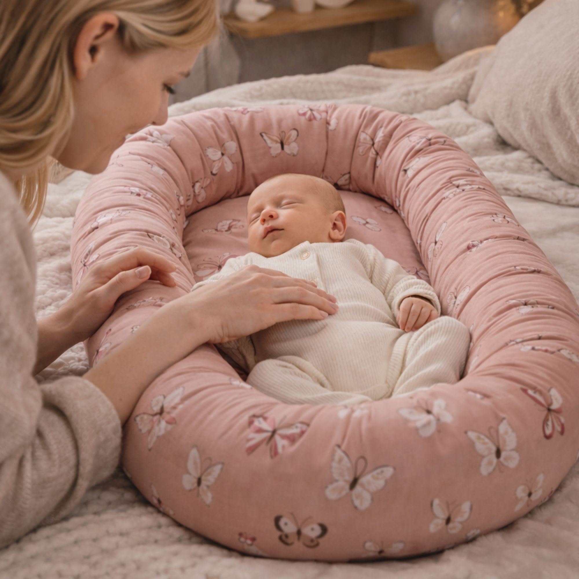 Het mooie roze design met vlinders creëert een rustig en gezellig uiterlijk, dat perfect past in de kinderkamer. Het babynest kan gebruikt worden in het babybedje, op de bank onder toezicht of als een vertrouwde basis onderweg.