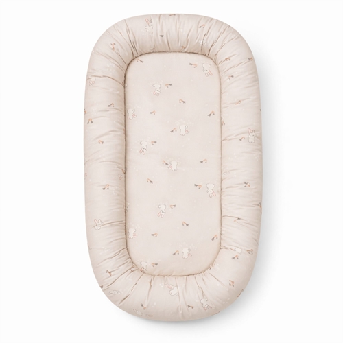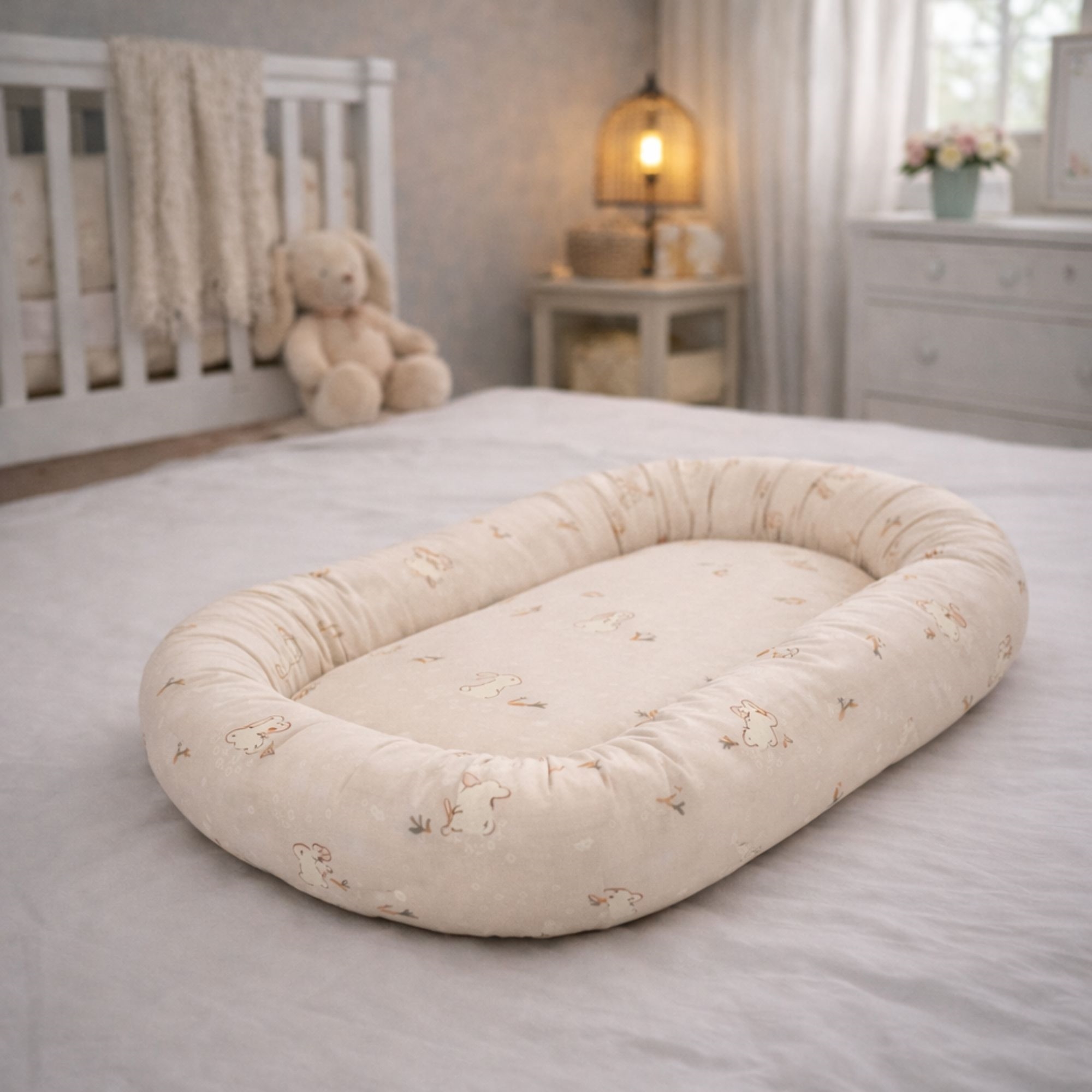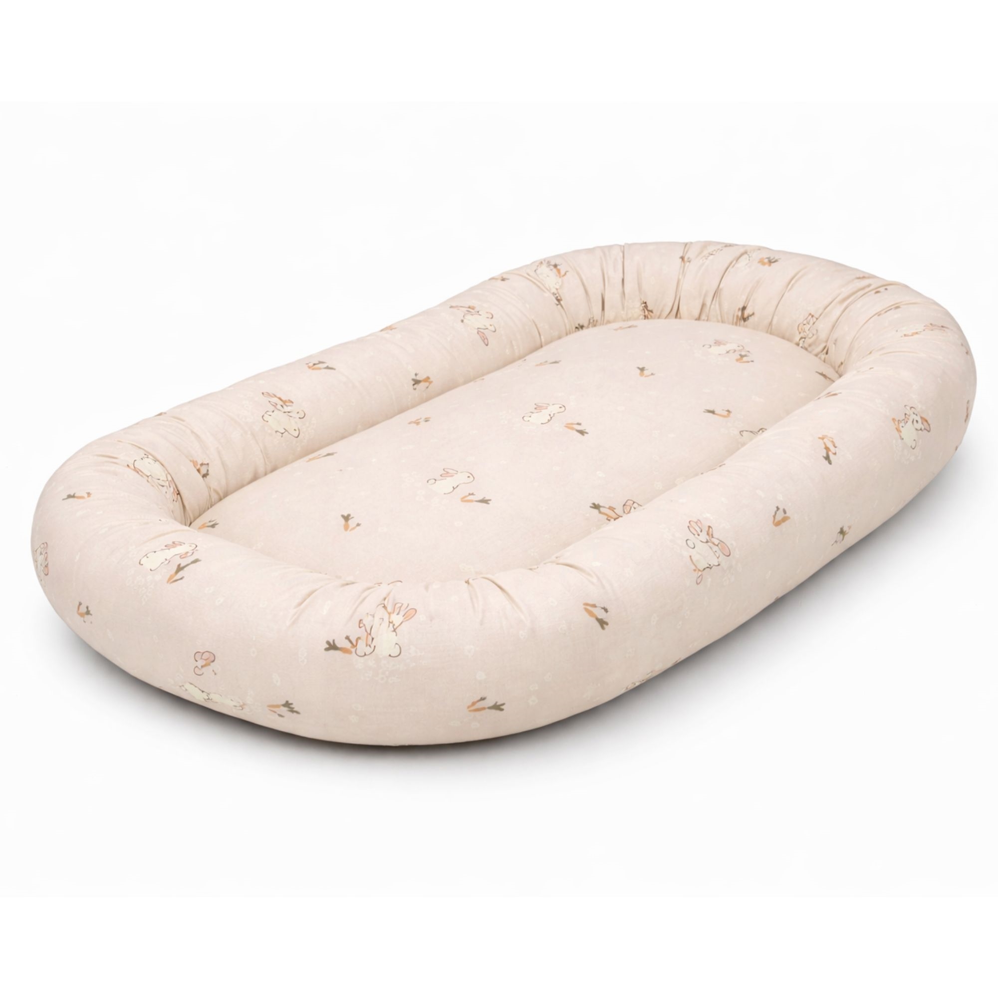 Comfortabele en veilige babynest 86x46 cm in zandkleur met konijntjes