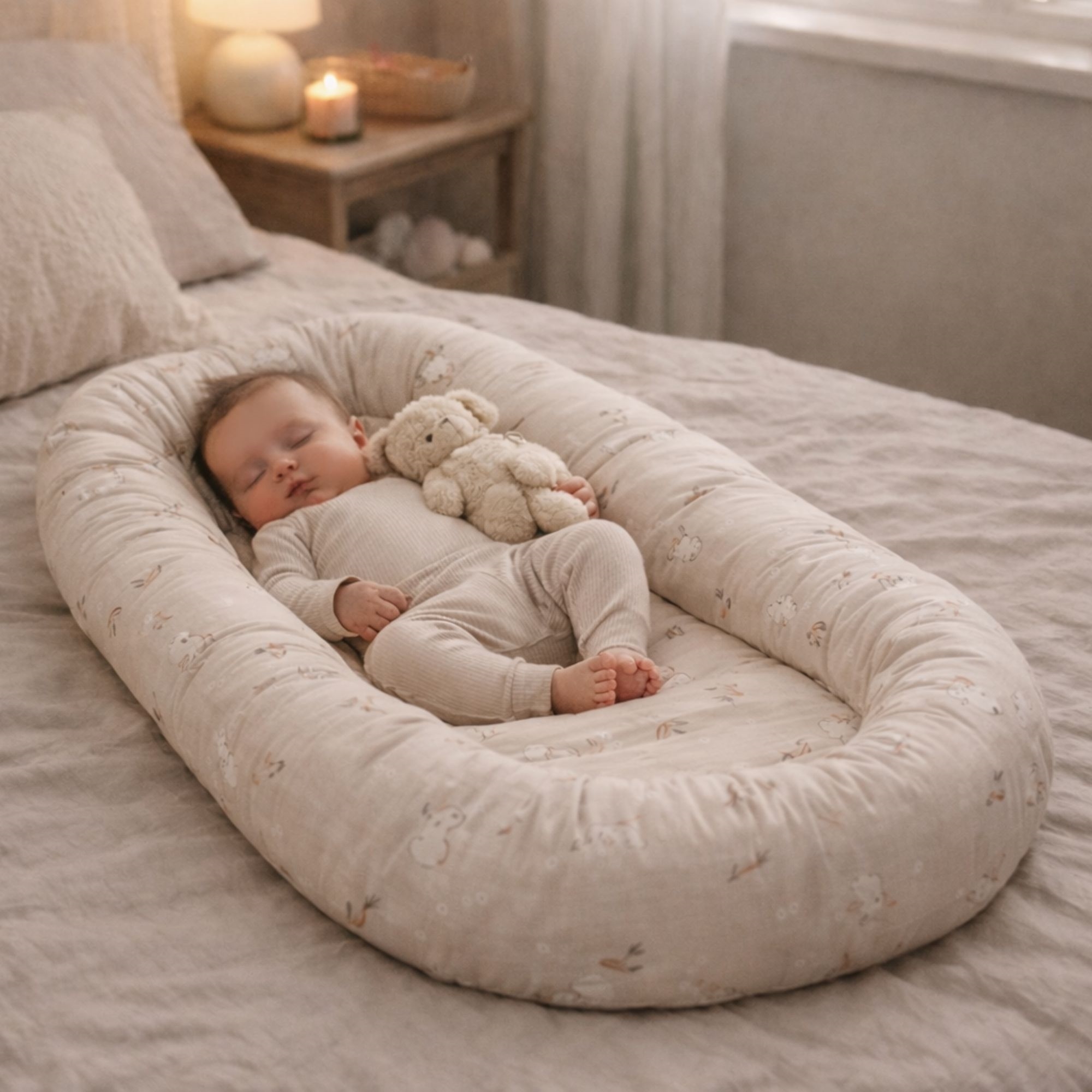 De babynest kan worden gebruikt in het wiegje, de kinderwagen of als een veilige basis op de bank onder toezicht. Hij is gemakkelijk te verplaatsen en geeft het kind een herkenbare en geborgen plek - zowel thuis als onderweg.