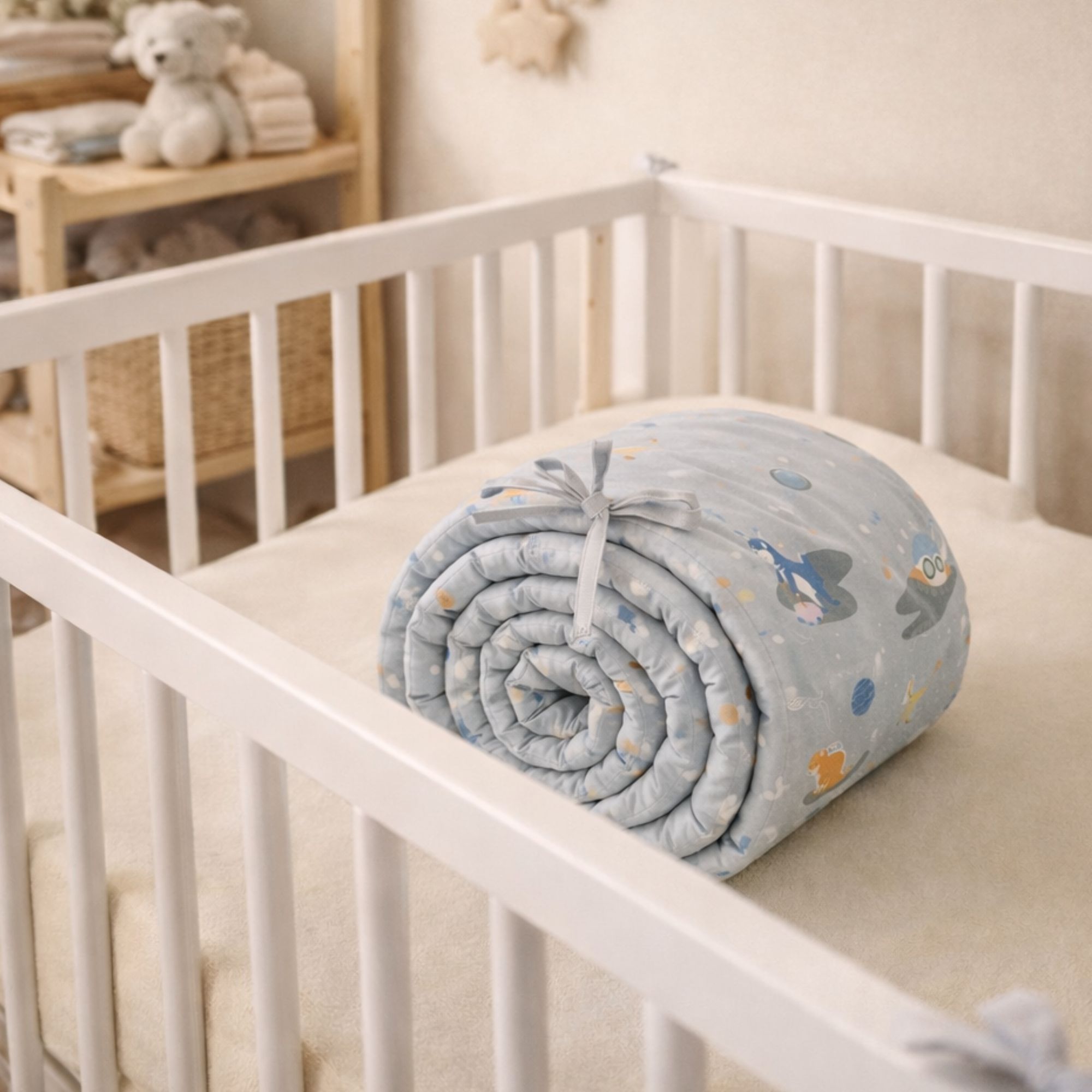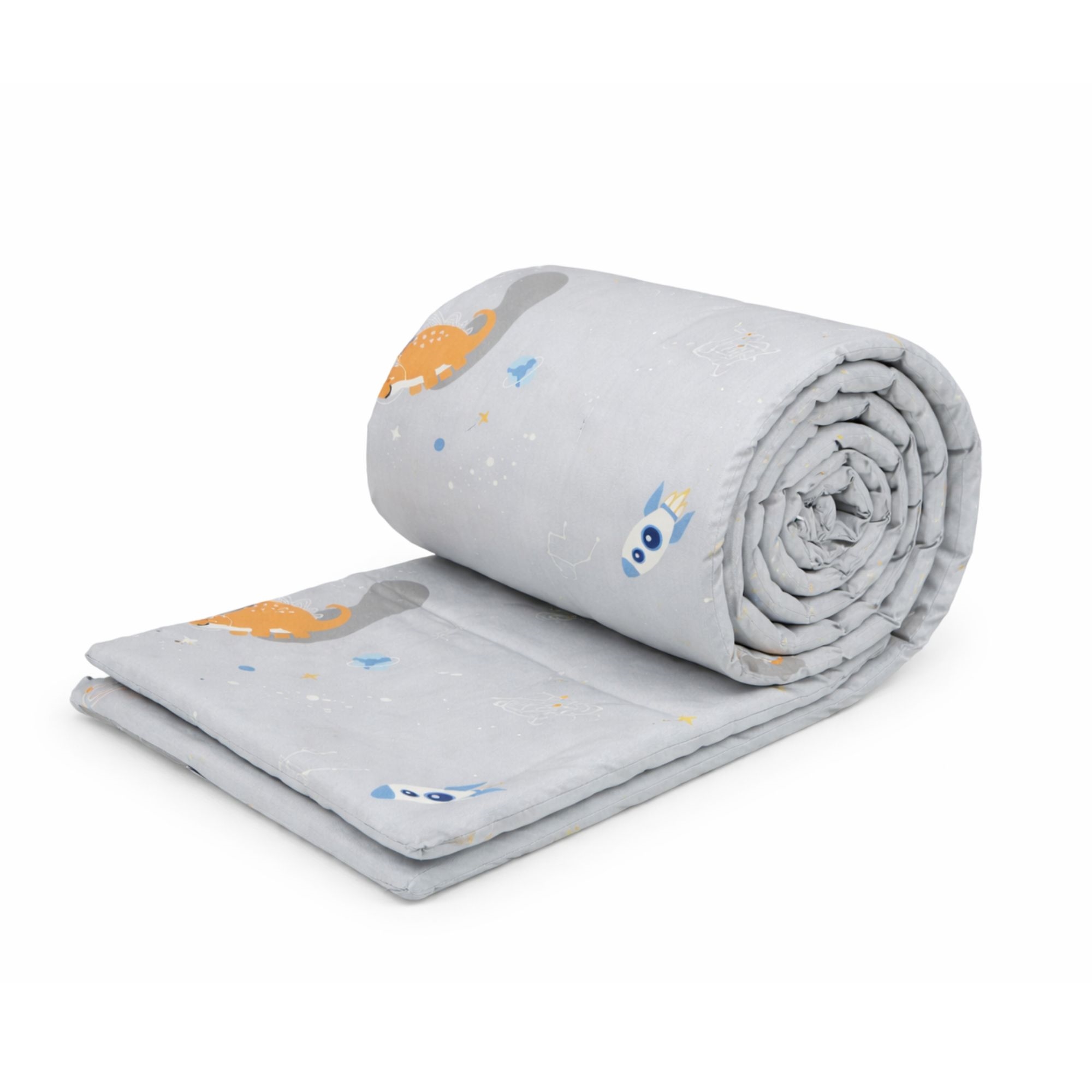 De hoes is gemaakt van 100% zachte katoen, die aangenaam en natuurlijk aanvoelt op de huid van het kind. Het verfijnde ontwerp in grijstinten met ruimte dinosaurus geeft een lief en rustig uiterlijk aan de kinderkamer.