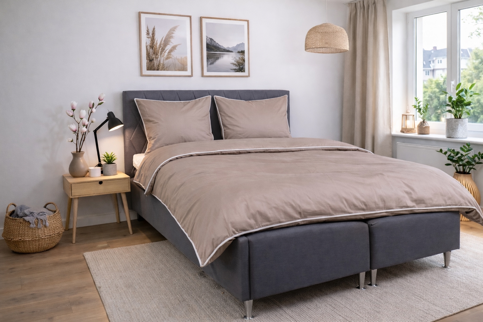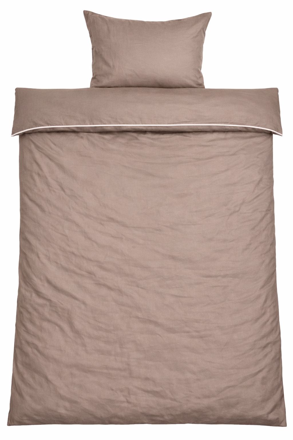De set heeft een hoge kleur- en wasbestendigheid, zodat zowel kleur als pipingdetails mooi blijven over tijd. Dekbedovertrek en kussensloop sluiten met een verborgen binnenritssluiting, wat zorgt voor een nette en minimalistische uitstraling en de deken op zijn plek houdt.