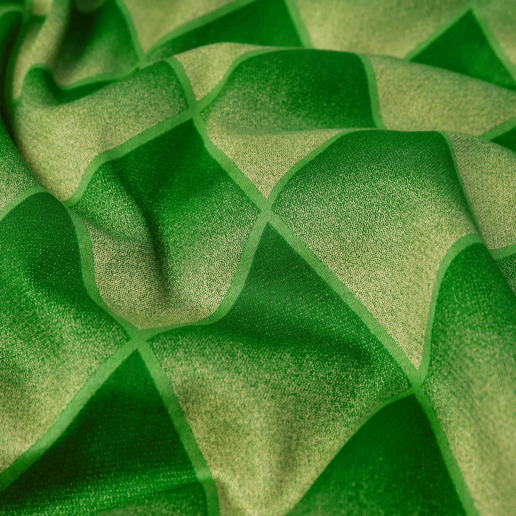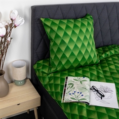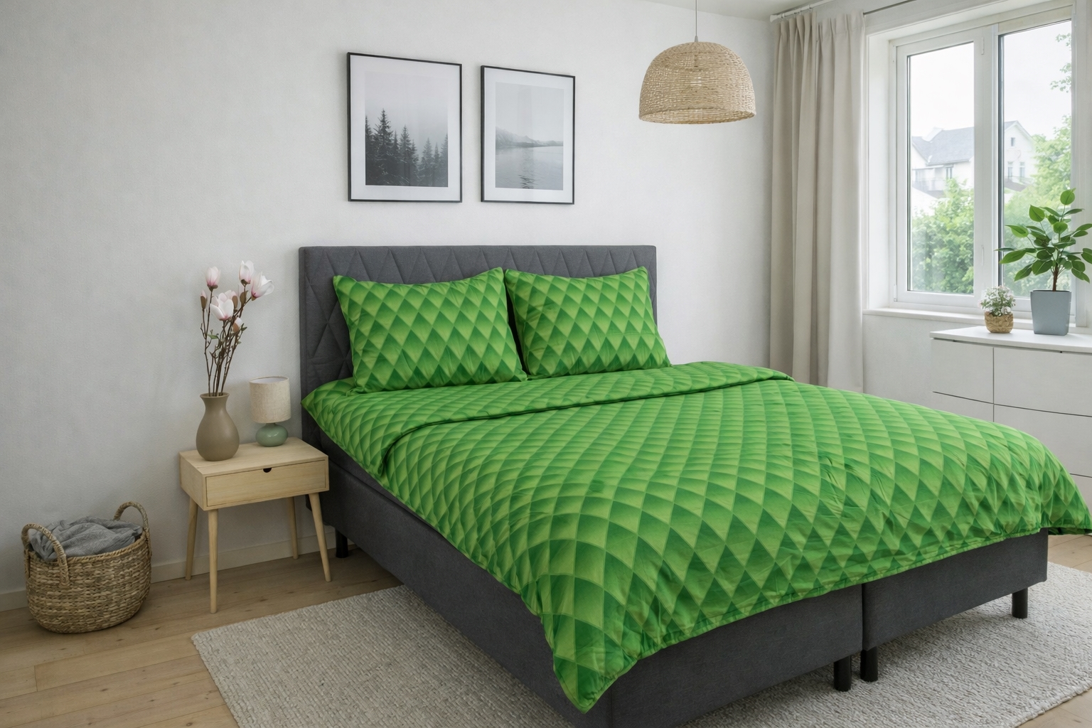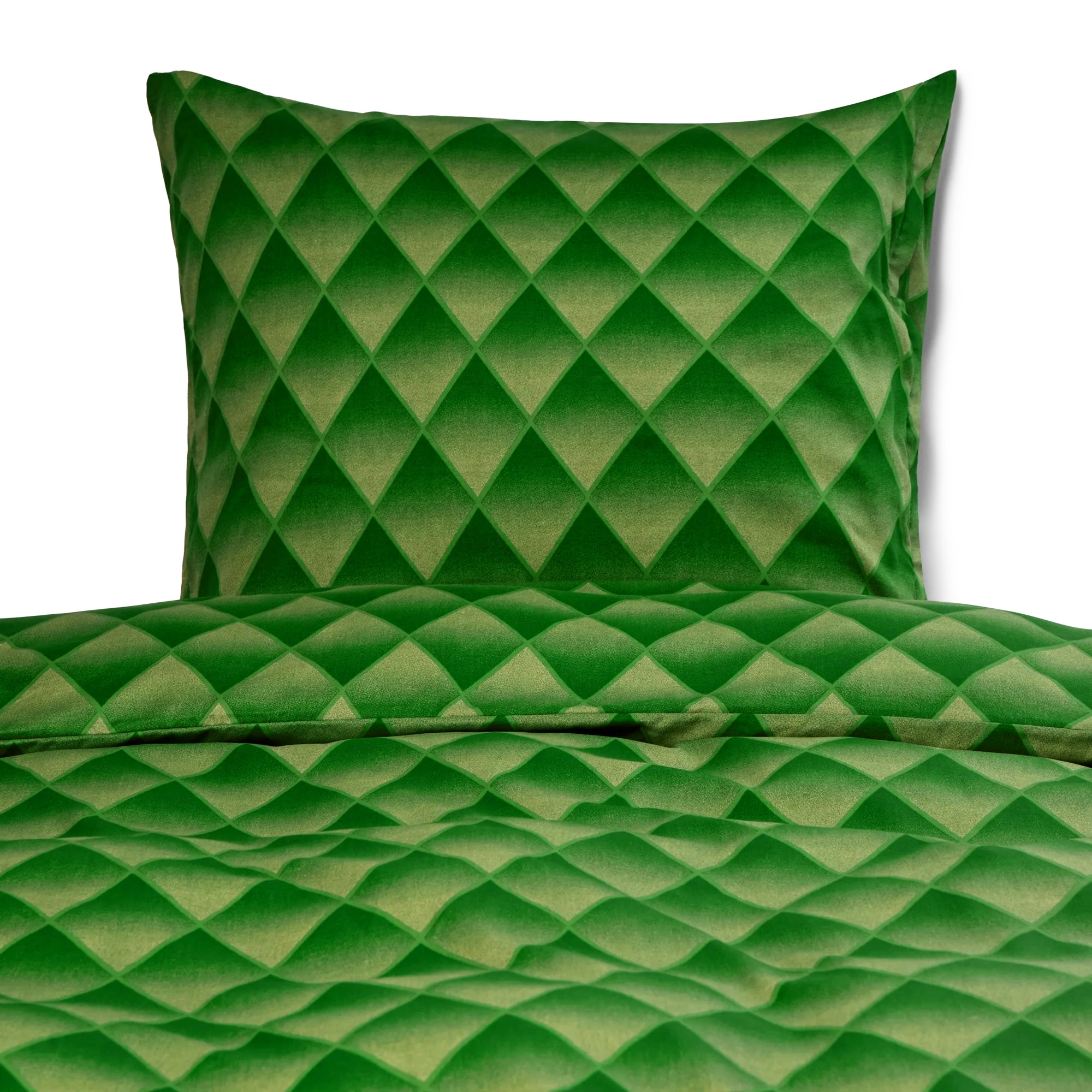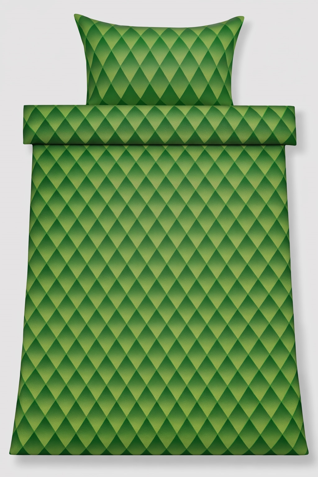 Geef de slaapkamer een exclusieve en moderne uitstraling met dit groene harlekijn beddengoed in 100% katoensatijn. Het gegradueerde diamantpatroon creëert een mooi 3D-effect, waarbij de kleuren harmonieus in elkaar overlopen en het bed diepte en karakter geeft. Een set dat zowel persoonlijkheid als elegantie toevoegt aan uw inrichting.
