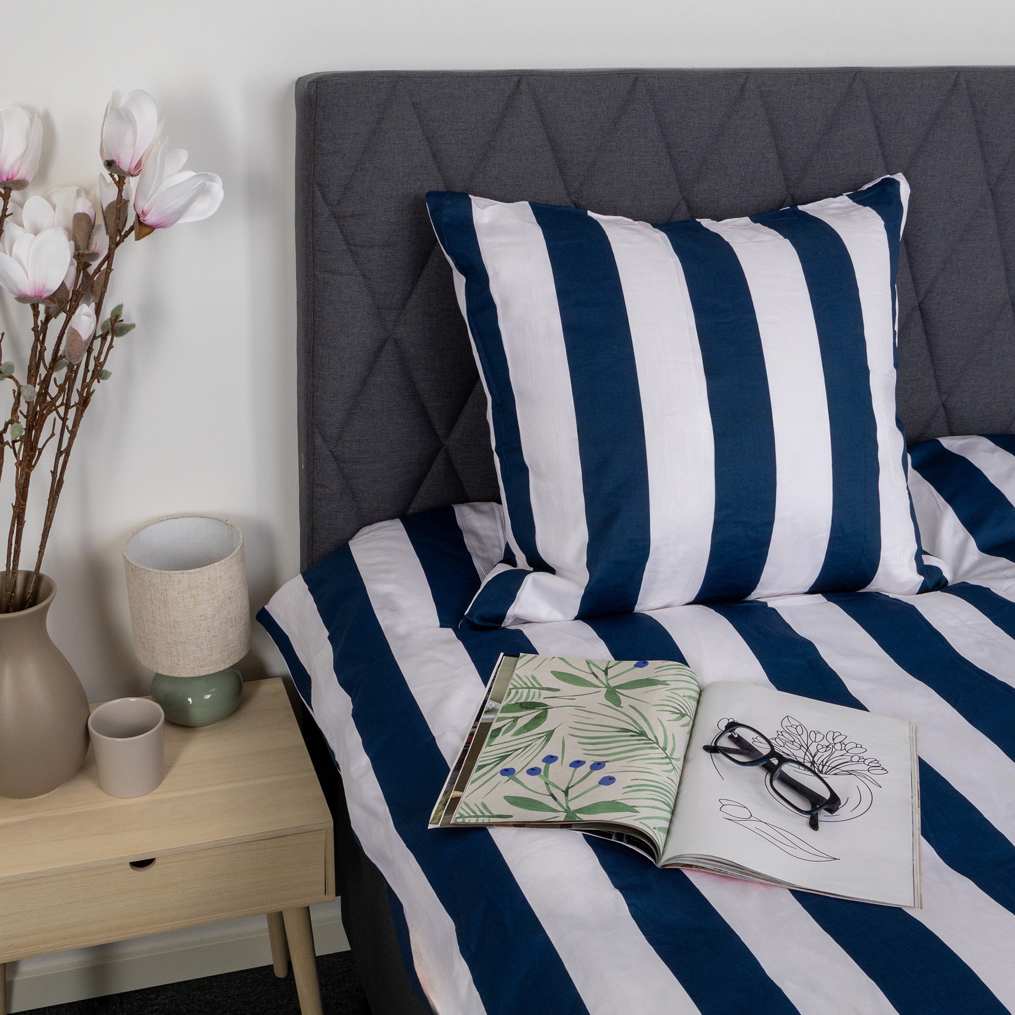 De brede streepprint zorgt voor een scherp en harmonieus uiterlijk. De combinatie van blauwe en witte strepen geeft de slaapkamer een ontspannen en rustig karakter, terwijl het ontwerp gemakkelijk te combineren is met verschillende sierkussens.
