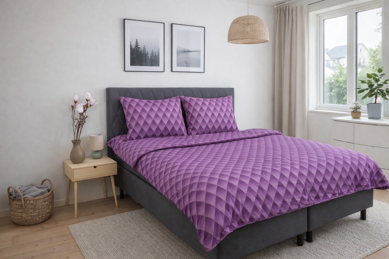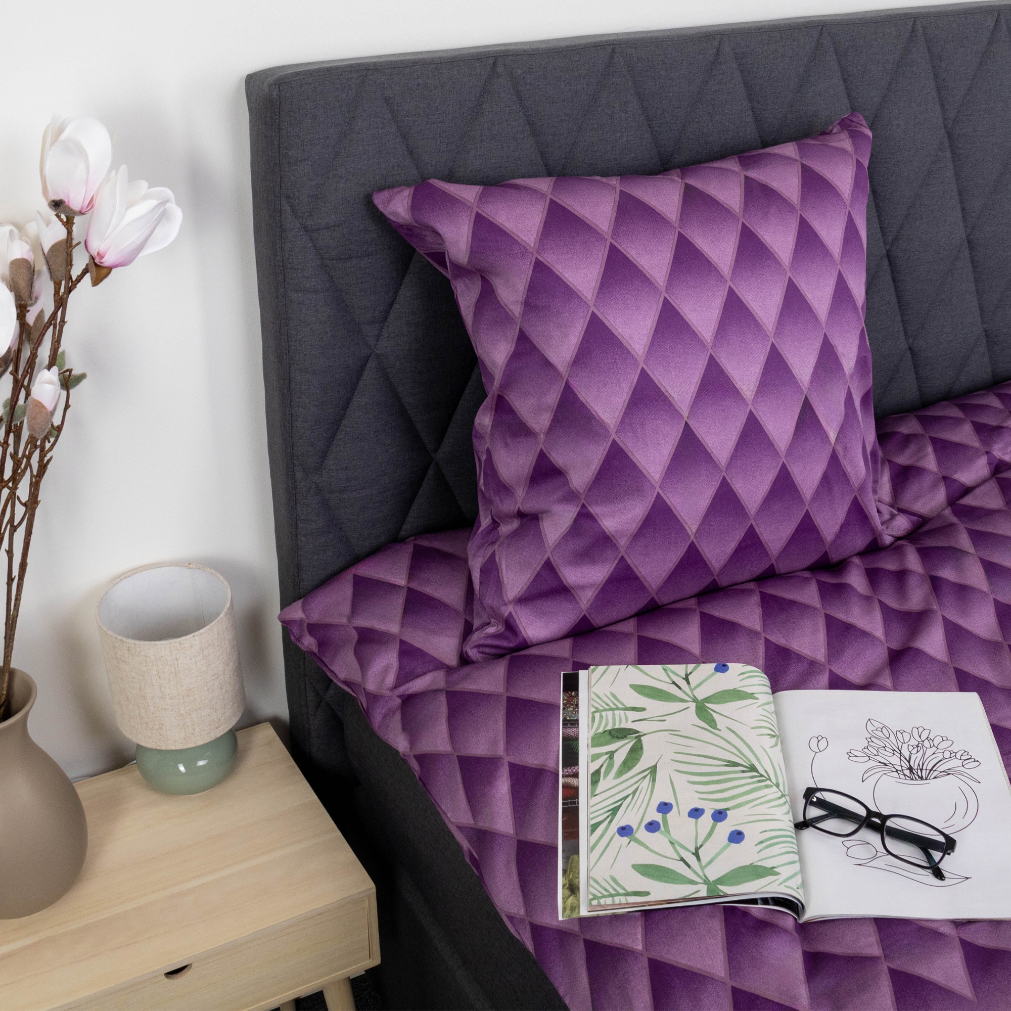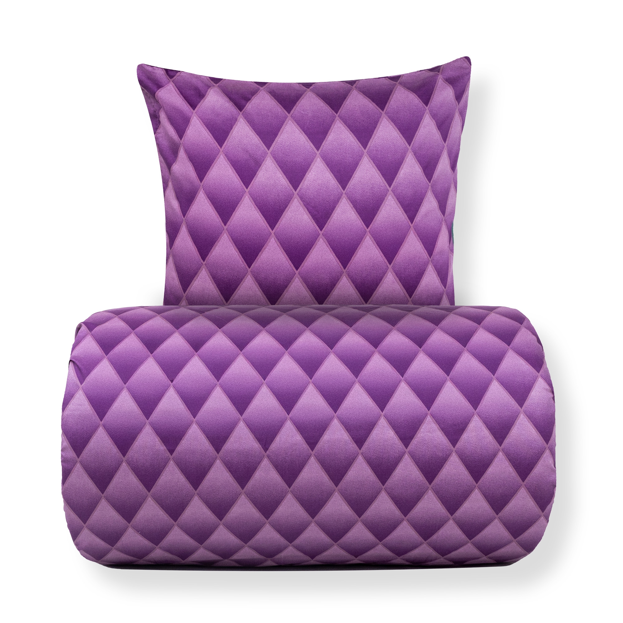 Geef de slaapkamer een exclusieve en moderne uitstraling met dit paarse harlekijn-beddengoed in 100% katoensatijn. Het gegradueerde diamantpatroon creëert een fraai 3D-effect, waarbij de kleuren harmonieus in elkaar overlopen en het bed diepte en karakter geeft. Een dekbedovertrekset die zowel persoonlijkheid als elegantie toevoegt aan uw inrichting.