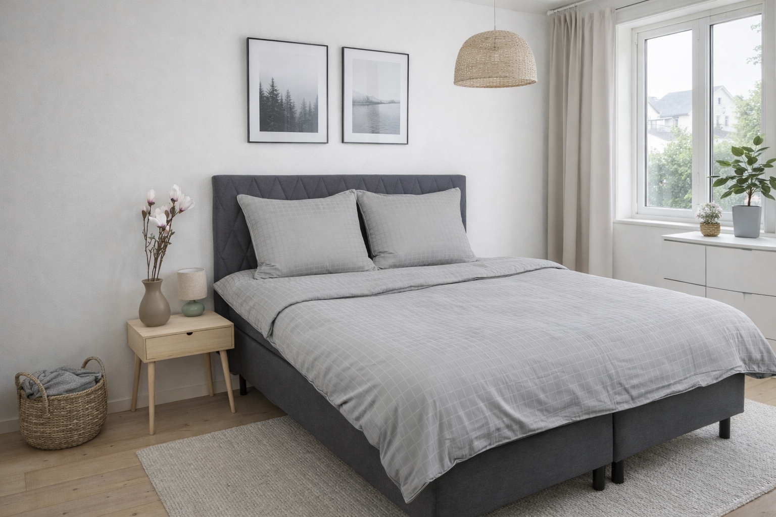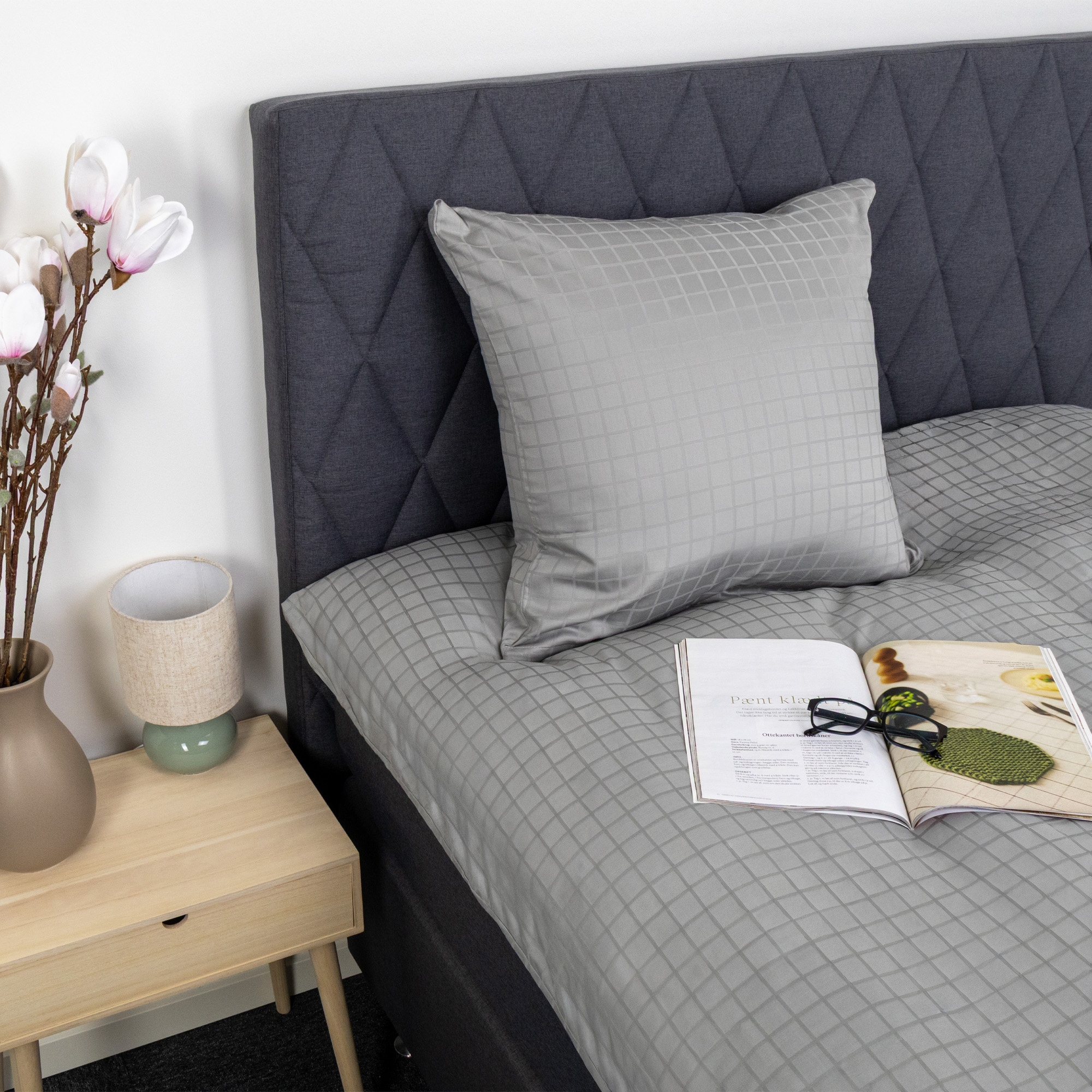 Het jacquardgeweven geruite patroon is rechtstreeks in de stof ingeweven en creëert structuur en diepte zonder gebruik van print. Deze weefmethode zorgt ervoor dat het patroon zijn uitstraling behoudt, was na was, en geeft het beddengoed een exclusieve en doordachte look. De grijze kleur ondersteunt het rustige ontwerp en past gemakkelijk in zowel moderne als klassieke slaapkamers.