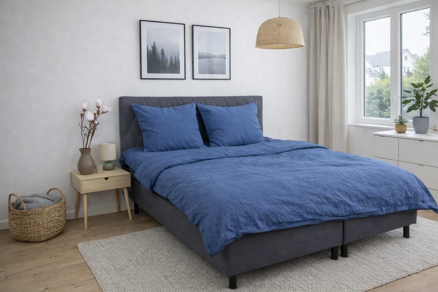 Dekbedovertrek en kussensloop worden beide gesloten met een binnenrits, wat het makkelijk maakt het beddengoed te verschonen en ervoor zorgt dat dekbed en kussen de hele nacht op hun plaats blijven. De blauw gemêleerde kleur creëert een rustig en natuurlijk uiterlijk dat goed past in zowel moderne als klassieke slaapkamers.