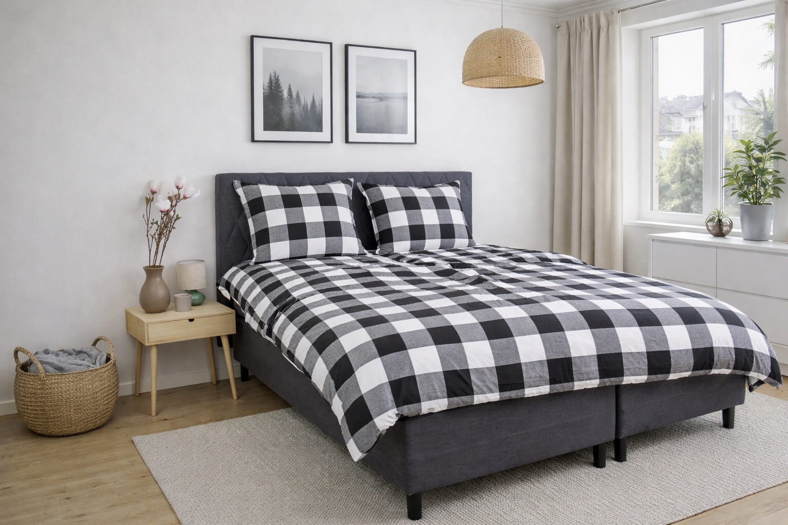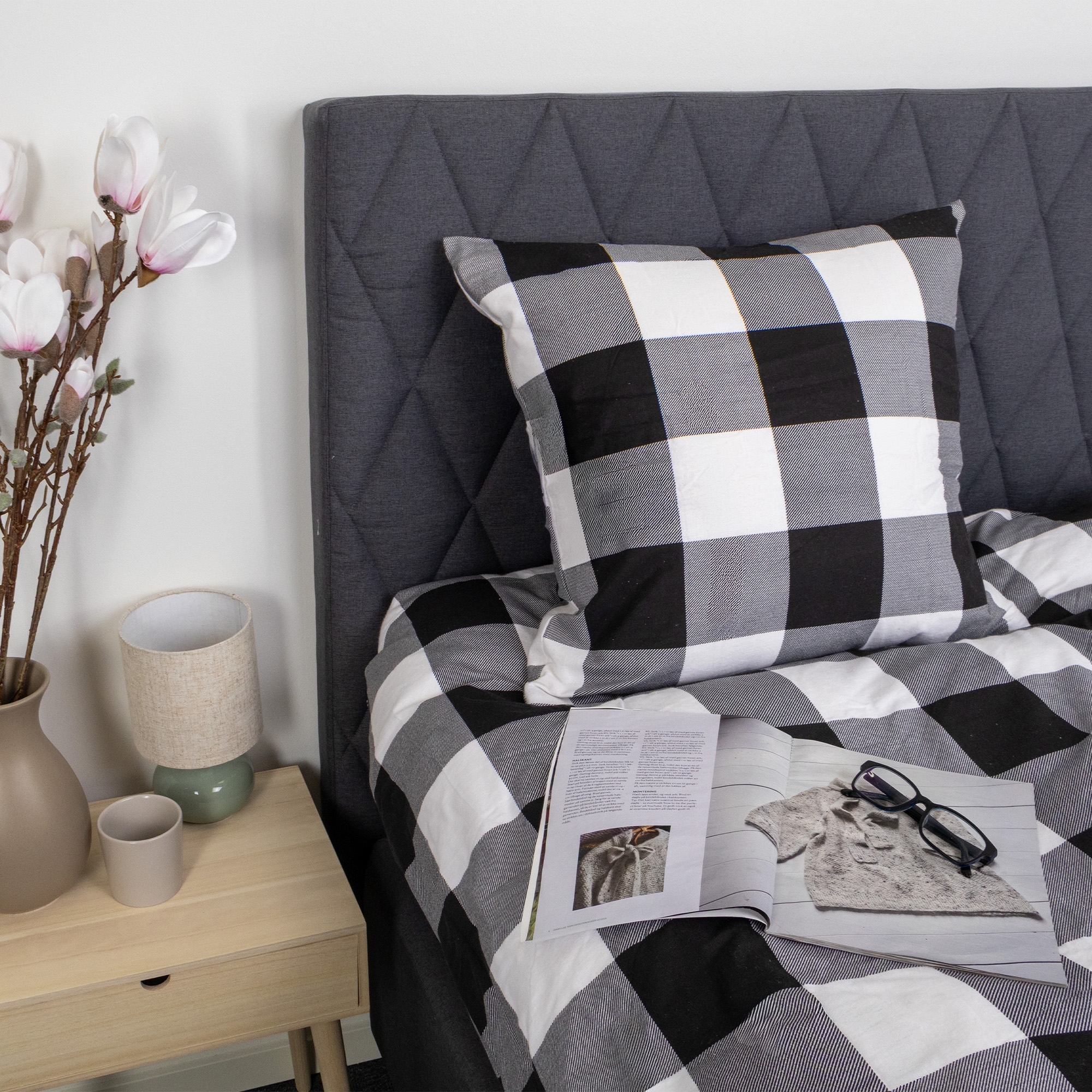 Voorpagina »Beddengoed Beddengoed 140x200 cm - Katoenen flanel beddengoed - Zwart-witte ruiten Bespaar50% By Night 68,4934,49EURBespaar 34,- Op voorraad Selecteer maat Selecteer variant Aantal In winkelwagen Bekijk meer van:By Night Artikelnr:263-1 Heb je vragen over het product? Warm en knus beddengoed dat prettig aanvoelt op de huidAdemend en zacht materiaal met hoog comfortOngelooflijk zacht en pluizig oppervlak Dekbedovertrek: 140x200 cm Kussensloop: 1 st. á 60x63 cm Materiaal: 100% katoenen flanel beddengoed Weving: 200TC (Thread count = aantal draden per vierkante inch) Kleur: Zwart-witte ruiten Design: Geruit Brand: By Night Sluiting: Dekbedovertrek en kussensloop met binnenrits Wassen: 60°C Geschikt voor de droger: Ja Strijken toegestaan: Ja Certificering: STANDARD 100 by OEKO-TEX® (20182KO658). Uw garantie dat het product vrij is van gezondheidsschadelijke chemicaliën. Katoenen flanel beddengoed met ruiten - extra zacht en warm Creëer een gezellige en uitnodigende sfeer in de slaapkamer met dit geruite flanel beddengoed. Het zachte katoenen flanel biedt een warme en comfortabele sensatie - perfect voor koude nachten. Het beddengoed is vervaardigd van 100% katoenen flanel met een dichte 200TC weving. Flanel wordt gekenmerkt doordat de katoenvezels opgeruwd en geborsteld zijn aan het oppervlak. Deze behandeling creëert de bekende, pluizige zachte structuur die flanel beddengoed extra prettig maakt om onder te liggen. Het geborstelde oppervlak houdt de warmte dichter bij het lichaam en geeft een heerlijk warme sensatie, zonder dat het materiaal zijn natuurlijke ademende eigenschappen verliest. Katoenen flanel is daarom een uitstekende keuze voor wie het ’s nachts snel koud heeft of op zoek is naar warmer beddengoed in de herfst- en wintermaanden. Tegelijkertijd is het materiaal slijtvast en blijft het zacht, was na was. Het geruite design combineert fraaie zwart-witte ruiten, wat zorgt voor een rustig en harmonieus uiterlijk in de slaapkamer. Een geruit beddengoed dat zowel warm aanvoelt als er elegant uitziet. Dekbedovertrek en kussensloop sluiten met een binnenrits, wat zorgt voor een nette en praktische afwerking. Het beddengoed is gecertificeerd volgens STANDARD 100 by OEKO-TEX, wat uw garantie is dat het product getest is en vrij van gezondheidsschadelijke chemicaliën. Het kan gewassen worden op 60°C en is geschikt voor de droger en om te strijken. Bekijk al ons flanel beddengoed hier By Night By Night, geproduceerd door Borg Design, kenmerkt zich door Deens design - ze bieden comfortabele producten voor uw slaap in de allerhoogste kwaliteit. By Night produceert beddengoed en lakens voor het hele gezin en legt veel nadruk op de trends van nu, zodat de productie altijd modieuze kleuren en designs bevat. Bekijk het volledige assortiment van By Night hier Terug naar Beddengoed