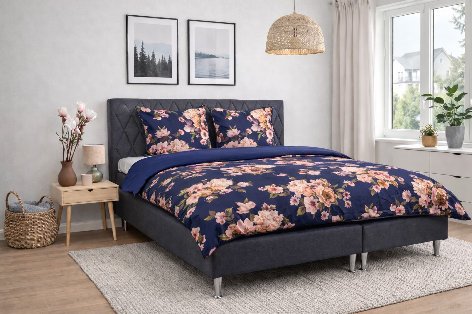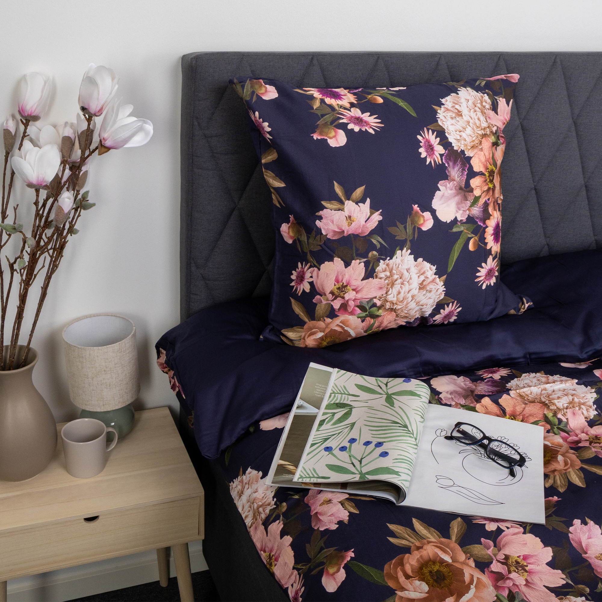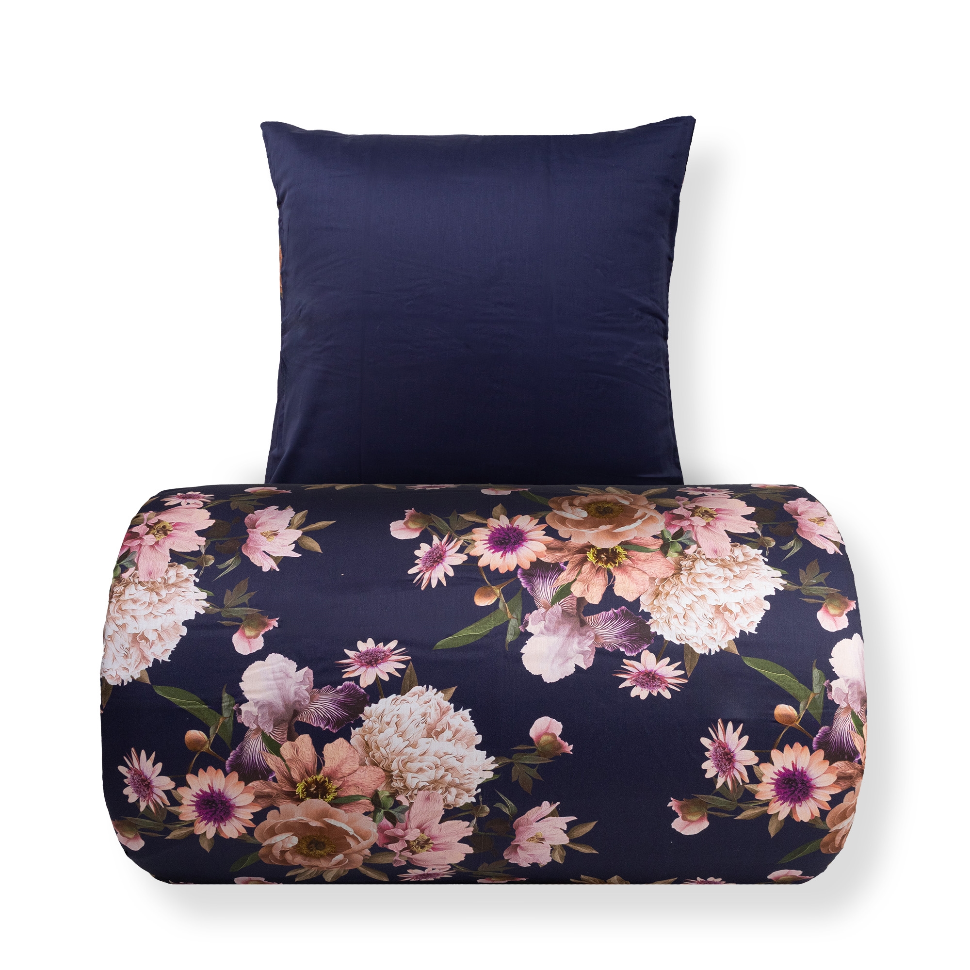 Creëer een elegante en persoonlijke uitstraling in de slaapkamer met deze omkeerbare dekbedovertrekset in 100% katoensatijn. Het beddengoed combineert een fraai bloemenprint in donkerblauw aan de ene kant met een rustige, effen achterkant, zodat u eenvoudig het uiterlijk kunt wisselen afhankelijk van sfeer en inrichting.