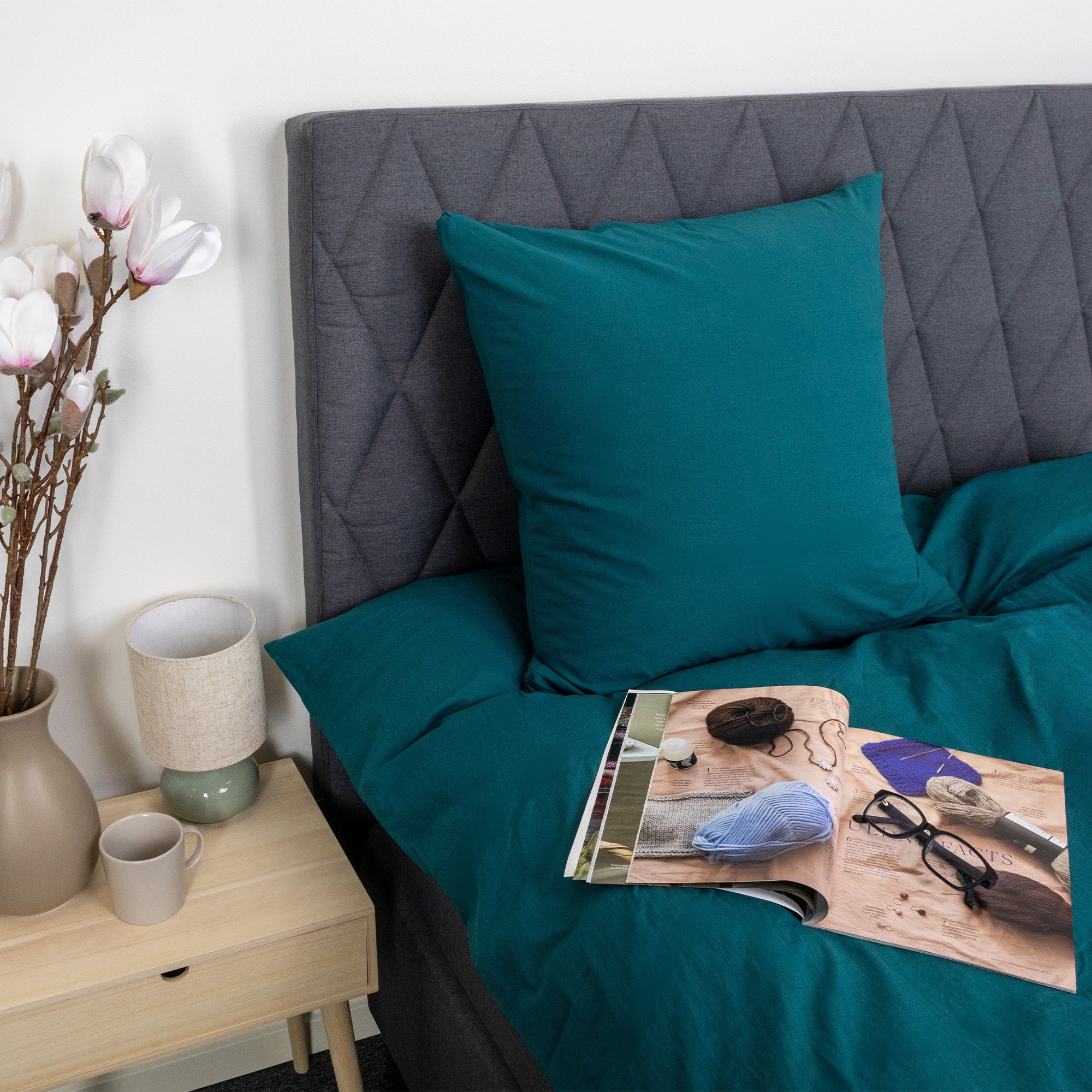 Dekbedovertrek en kussenslopen worden gesloten met een binnen verborgen rits, wat zorgt voor een strak uiterlijk en het eenvoudig maakt om van beddengoed te wisselen. De blauwgroene tint en het effen ontwerp maken de set gemakkelijk te combineren met zowel lichte als donkere elementen in de slaapkamer.