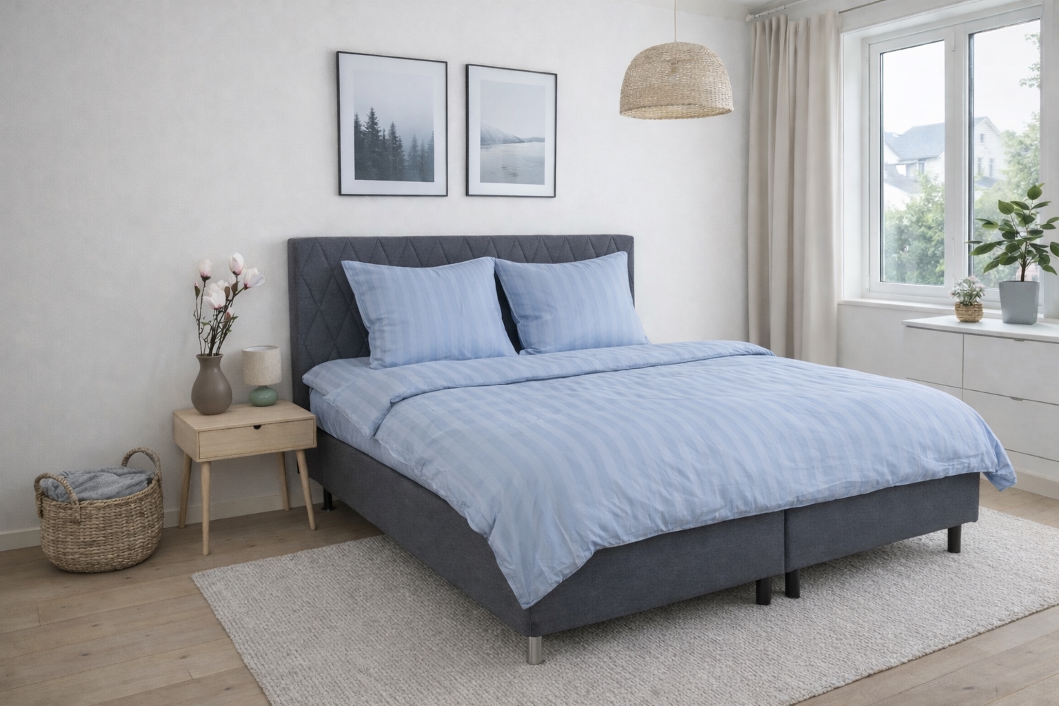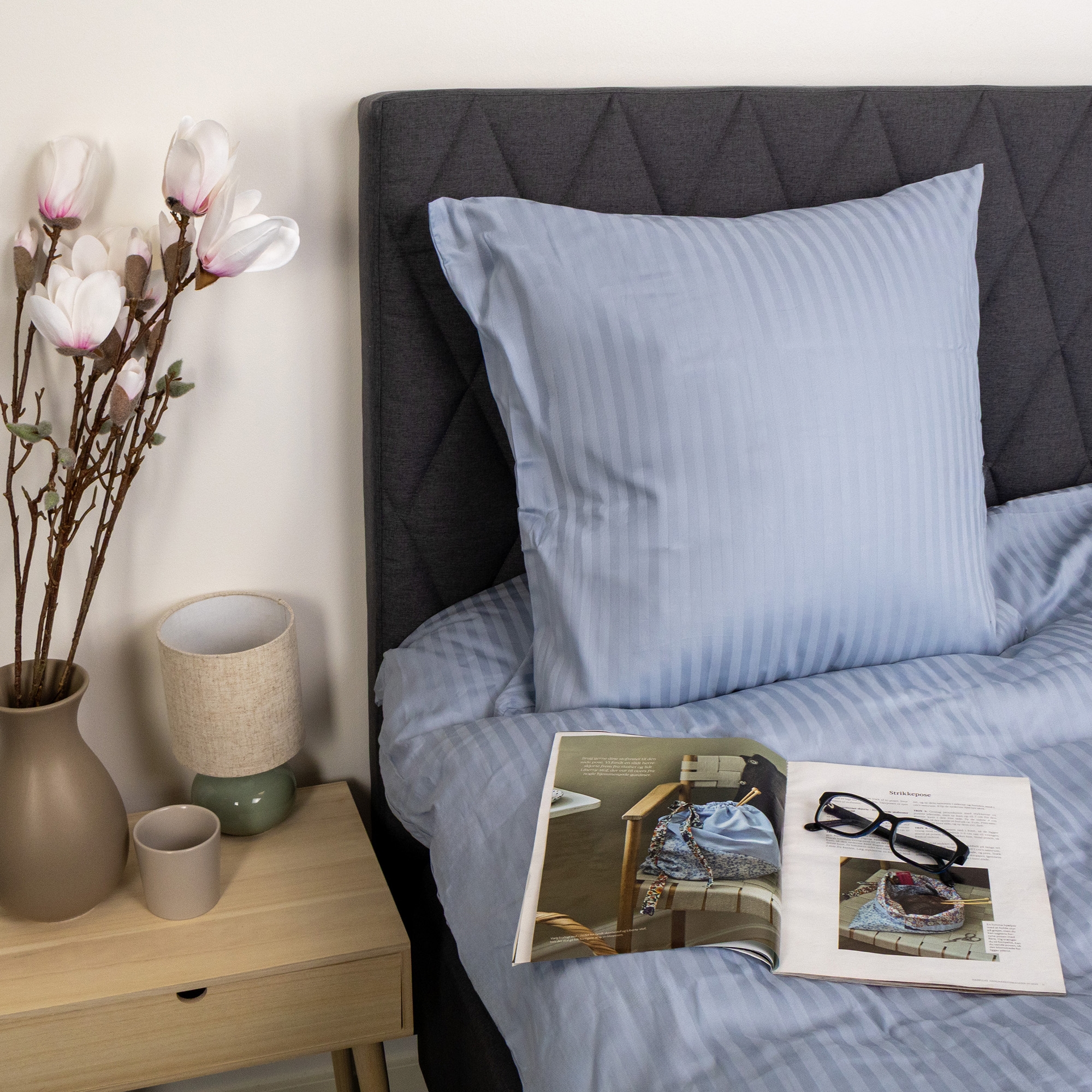 Creëer een elegante en exclusieve uitstraling in de slaapkamer met dit lichtblauwe gestreepte beddengoed in 100% katoensatijn. Het beddengoed combineert klassiek design met hoog comfort en is gemaakt voor wie zowel luxe als functionaliteit in het dagelijks leven wenst.