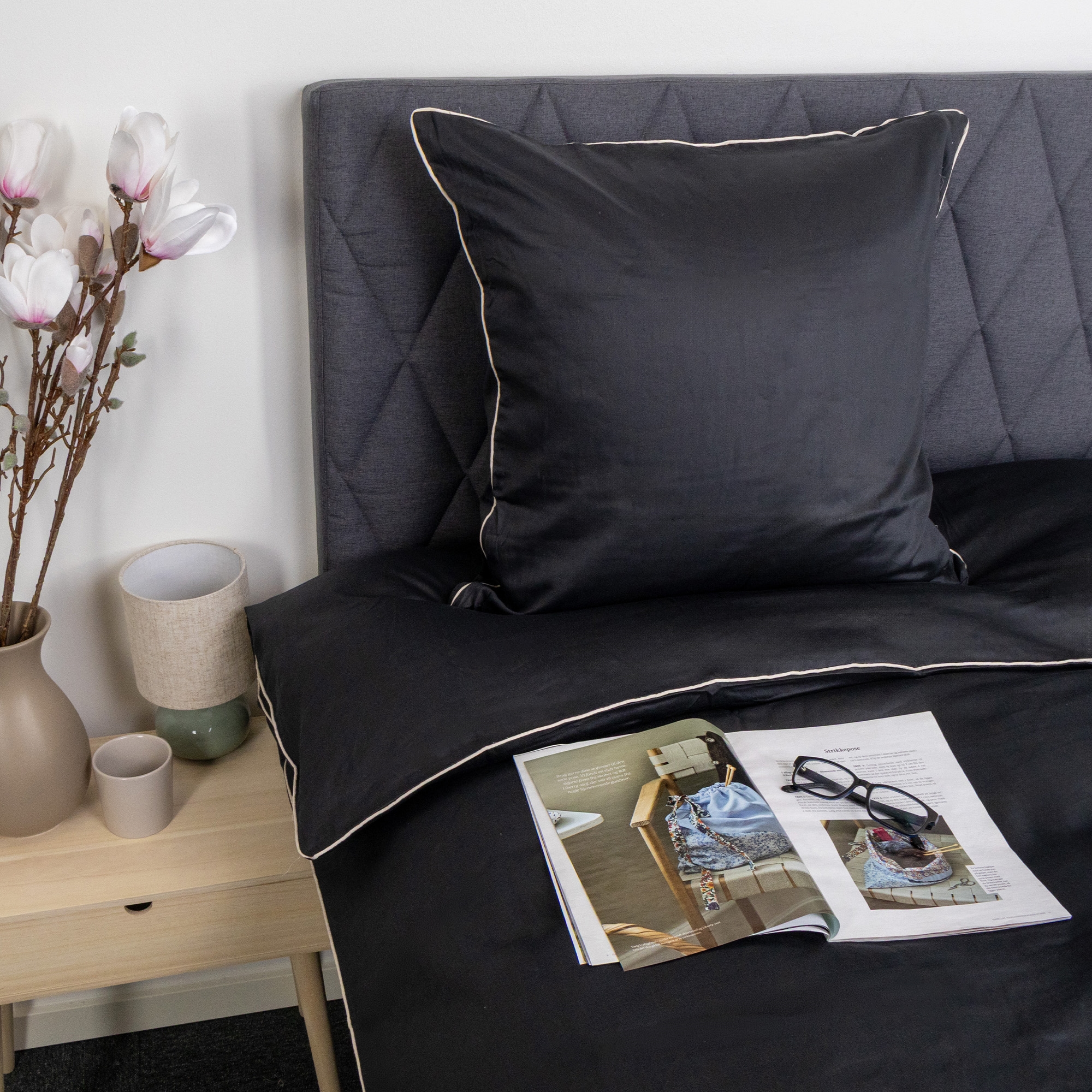 Creëer een elegant en luxueus uiterlijk in de slaapkamer met dit exclusieve dekbedovertrekset van 100% katoensatijn met decoratieve bies van By Borg. Het effen ontwerp in diep zwart gecombineerd met een witte bies geeft een strakke en verfijnde uitstraling die de algehele sfeer van de slaapkamer verhoogt.