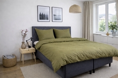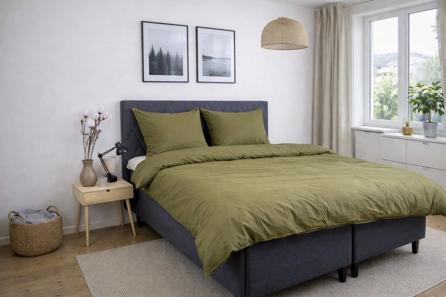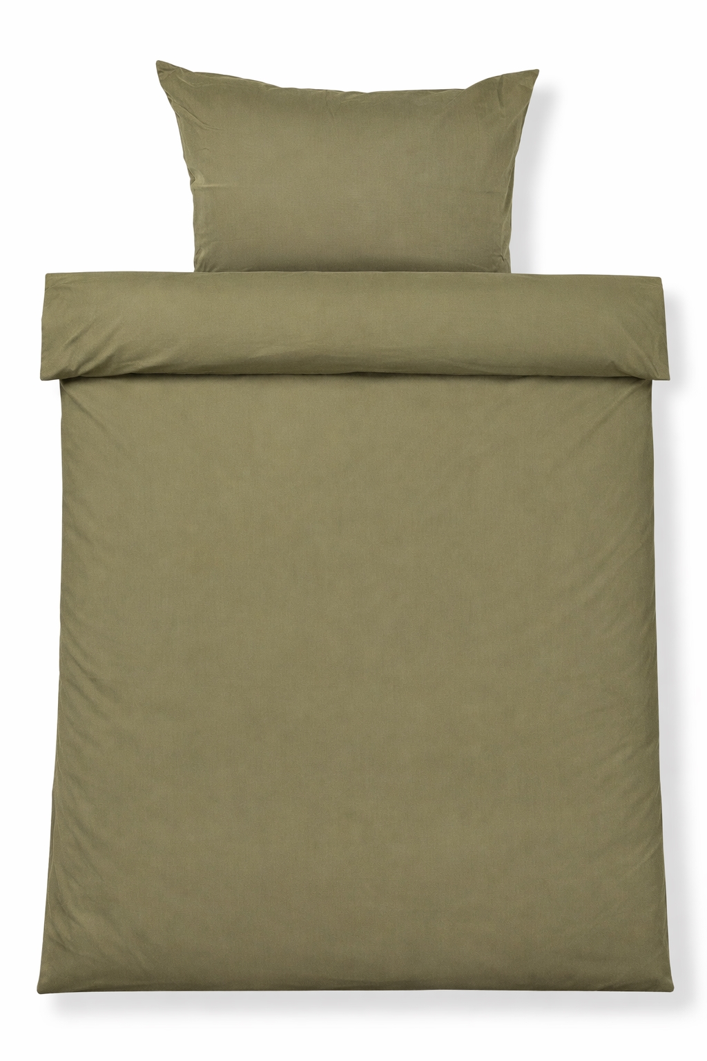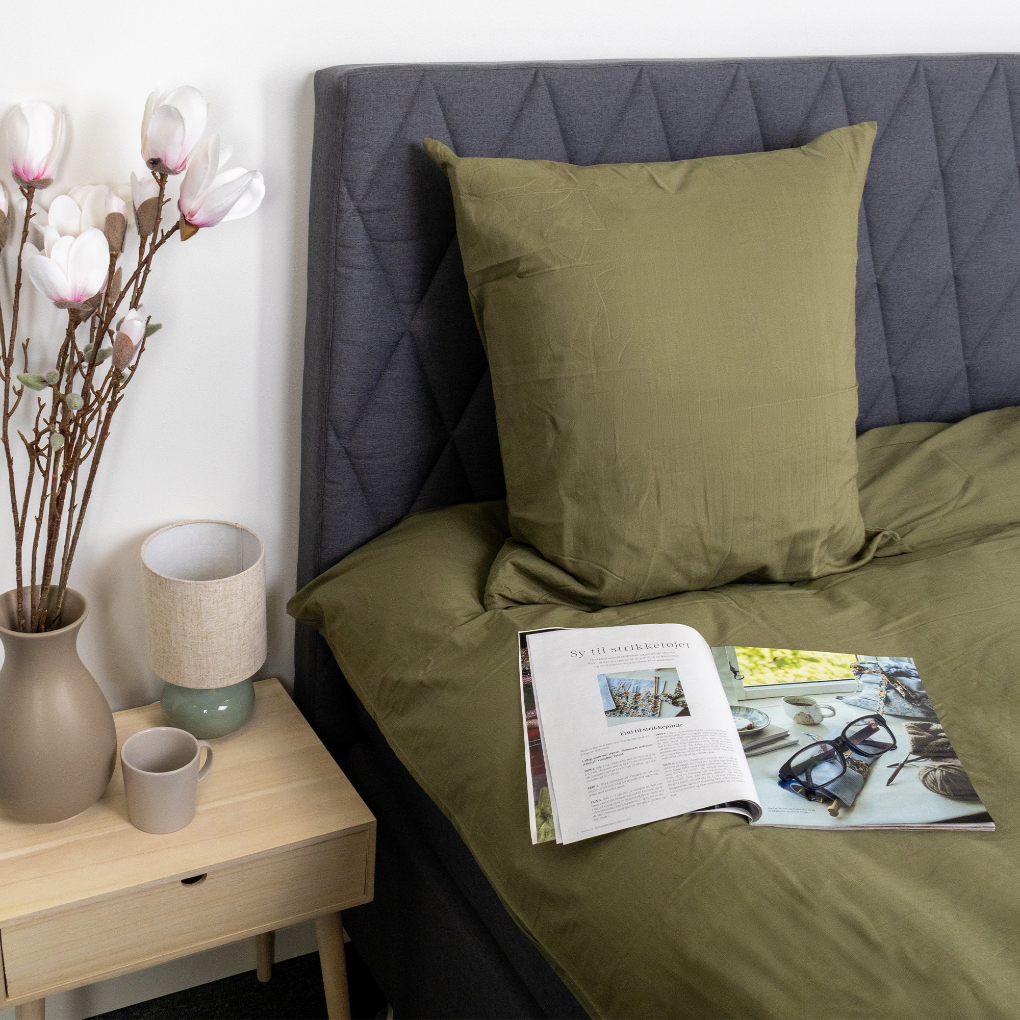 Dekbedovertrek en kussenslopen worden gesloten met een verborgen binnenrits, wat zorgt voor een strakke uitstraling en het wisselen van beddengoed gemakkelijk maakt. De groene tint en het effen design maken het beddengoed eenvoudig te combineren met zowel lichte als donkere elementen in de slaapkamer.