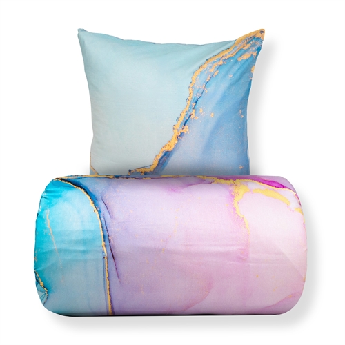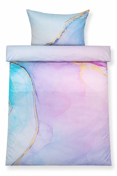 Geef de slaapkamer een elegant en modern uiterlijk met dit katoensatijn dekbedovertrek voor tweepersoonsdekbed in blauw en roze marmerlook. De gedetailleerde marmer digitale print creëert een exclusieve, bijna 3D-achtige diepte in het ontwerp, waarbij de fijne goudkleurige lijntjes en zachte kleurverlopen zorgen voor een geraffineerde en artistieke uitstraling.