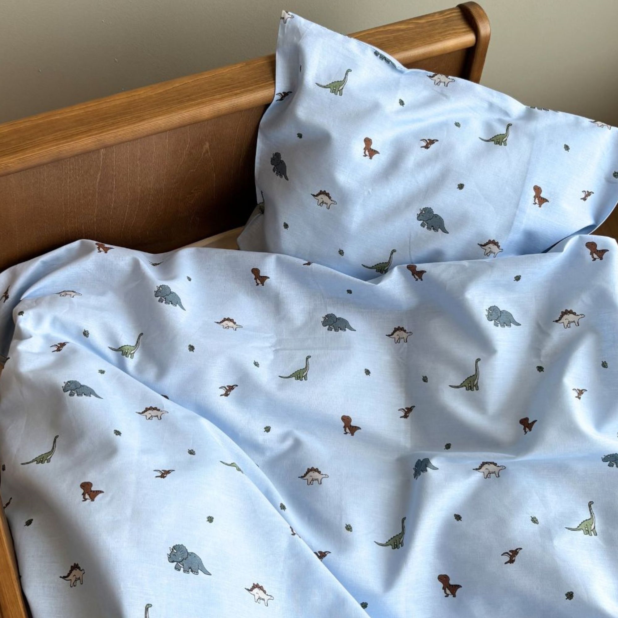 Creëer een lichte en rustige sfeer in de kinderkamer met dit mooie babybeddengoed van By Mats in een lichtblauwe kleur met kleine, decoratieve dinosauriërs. Het eenvoudige en nordische ontwerp geeft een zacht en harmonieus uiterlijk, dat zowel in moderne als klassieke interieurs mooi past.
