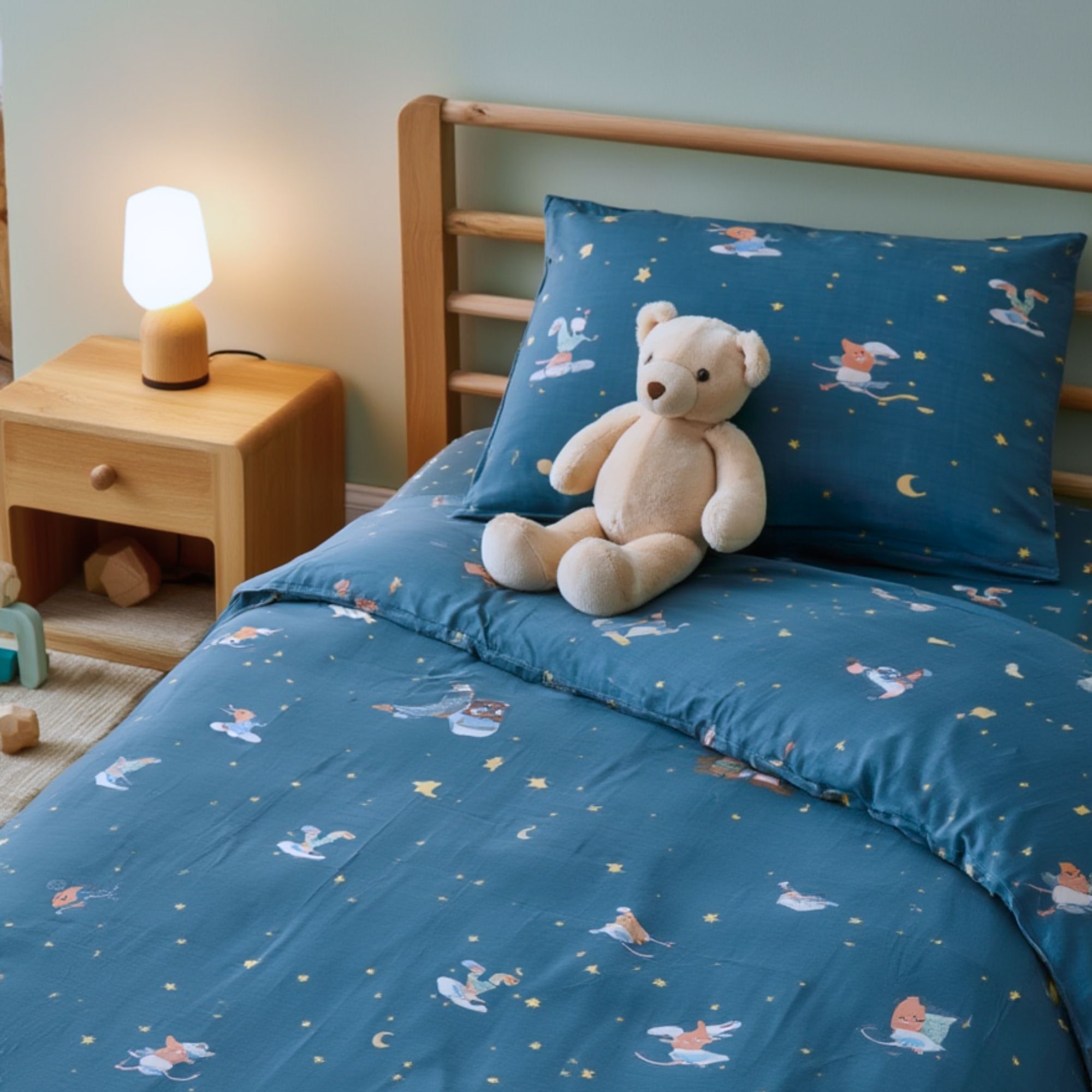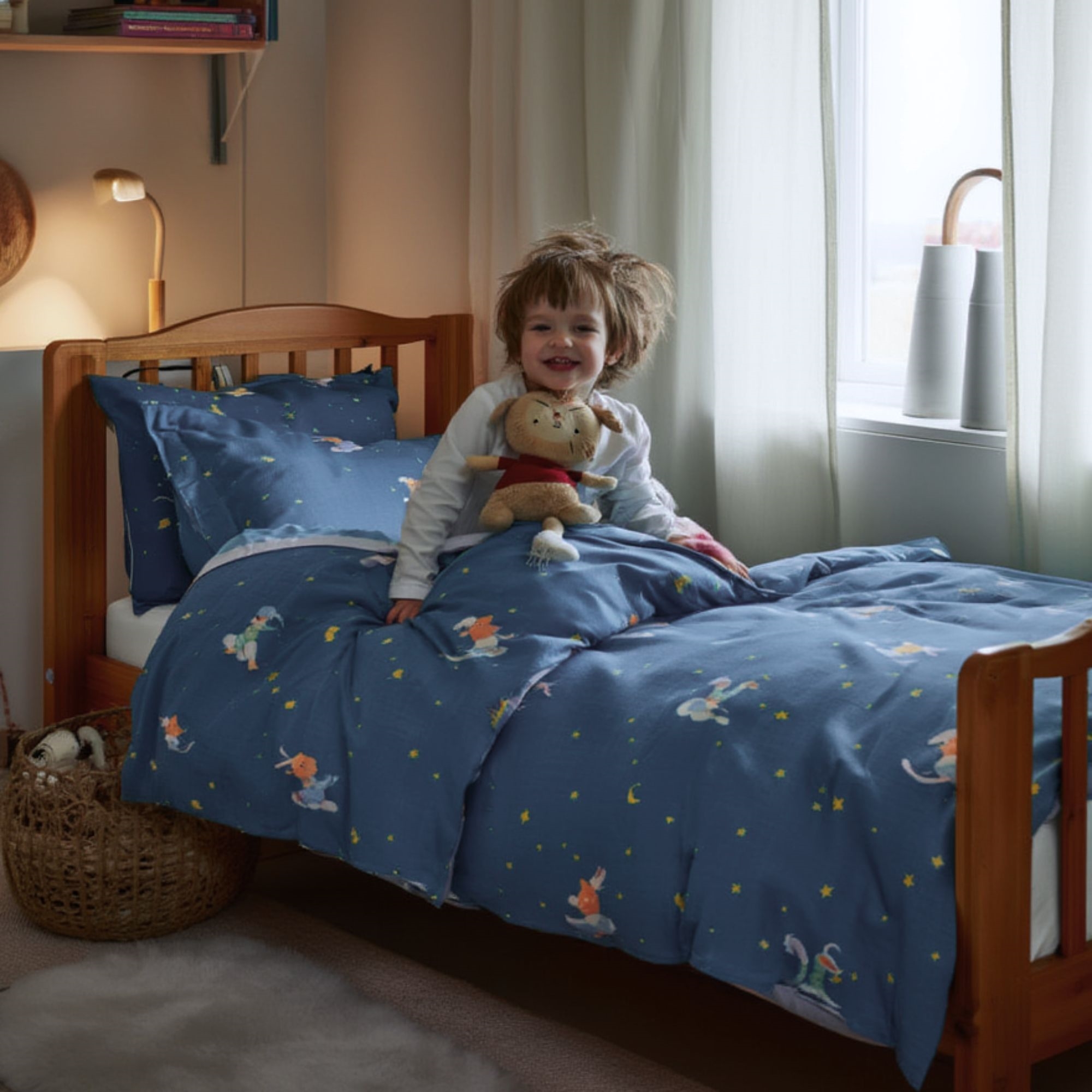 Het beddengoedset is gemaakt van 100% zacht katoen, dat ademend is en zacht voor de kwetsbare huid van de baby. De natuurlijke eigenschappen van katoen helpen de temperatuur gedurende de nacht te reguleren, zodat je baby een veilige, comfortabele en rustige slaap krijgt – het hele jaar door.