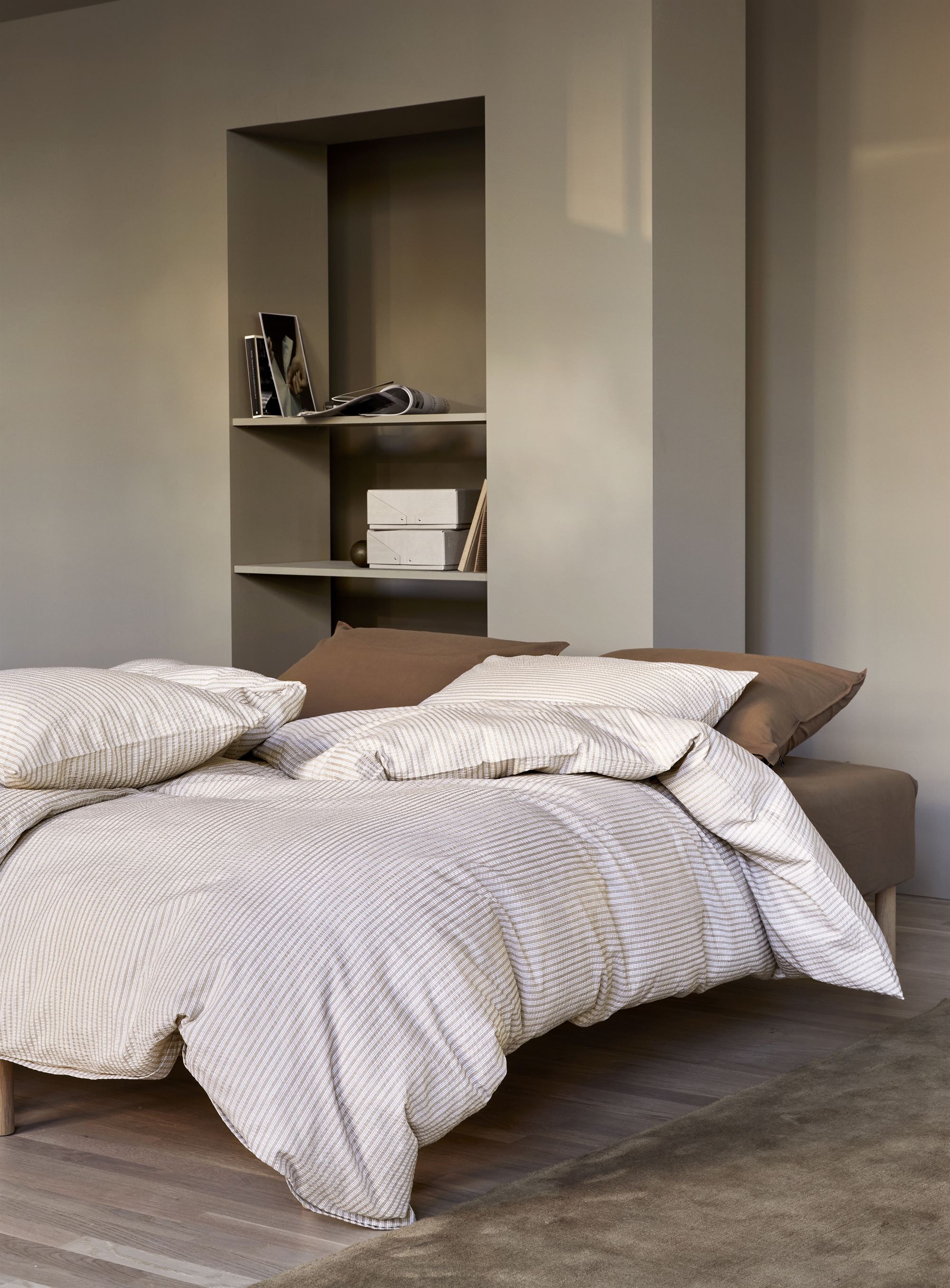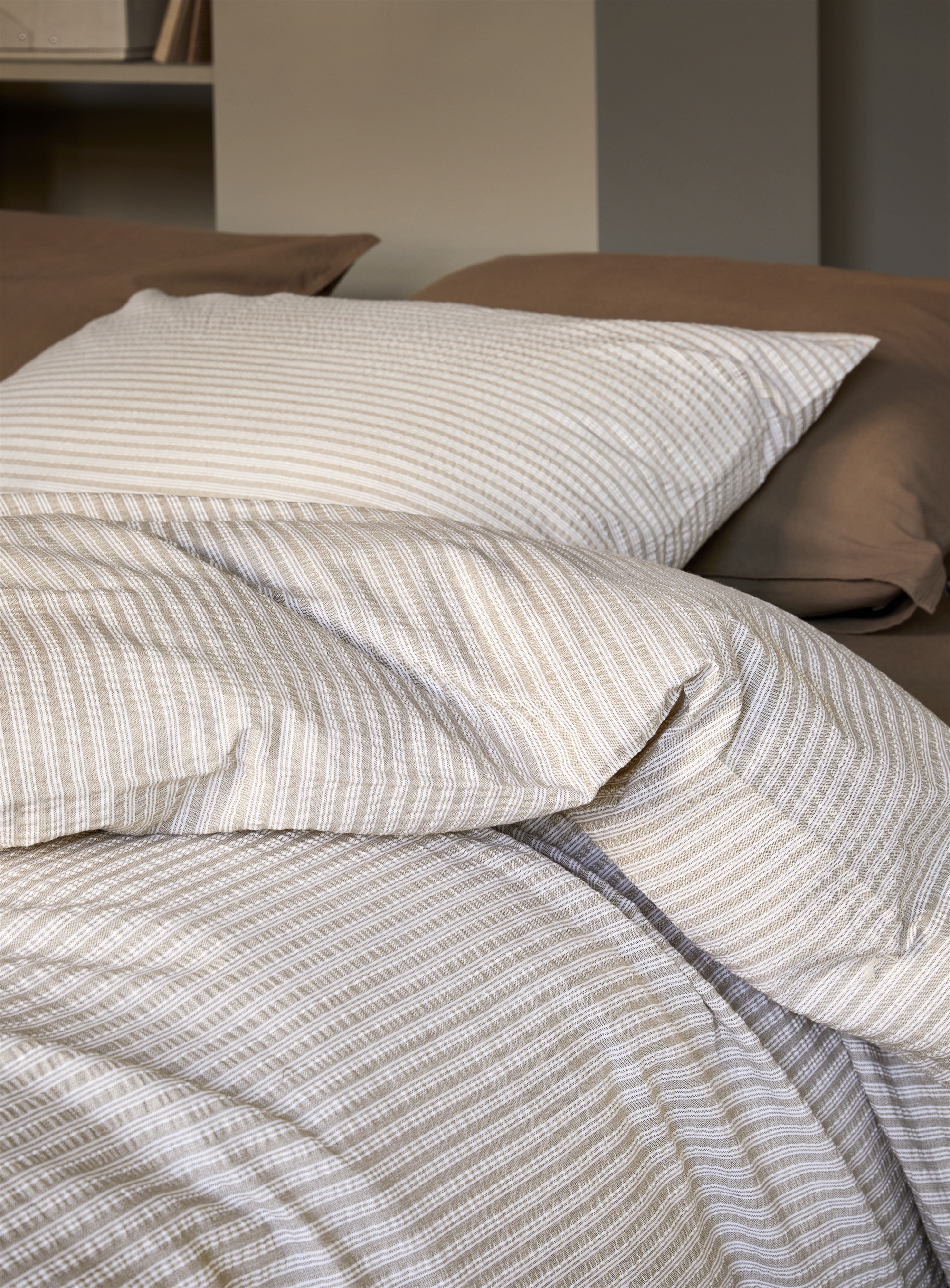 Voorpagina »Beddengoed » Eenpersoons beddengoed » Extra lang beddengoed 140x220 cm Geweven krepp beddengoed 140x220 cm - 100% zacht katoen - Bruin met strepen - Seersucker beddengoed - Slumre Høie Of Scandinavia Bespaar14% Høie Of Scandinavia 95,4981,99EURSpar 14,- Weinig op voorraad Selecteer maat Selecteer variant Aantal In winkelwagen Bekijk meer van:Høie Of Scandinavia Artikelnr:8351-2 Lees onze beddengoedgids Bekijk ons grote assortiment lakens Bekijk ons grote assortiment dekbedden 140x220 Heb je vragen over het product? OEKO-TEX® gecertificeerdZacht, licht en luchtigExclusief luchtig geweven krepp Dekbedovertrek: 140x220 cm Kussensloop: 1 st. à 60x63 cm Materiaal: 100% zacht katoen - Geweven krepp Weefsel: 200TC Seersucker beddengoed (Thread count = aantal draden per vierkante inch) Kleur: Bruin met strepen Design: Slumre karamelbruin Merk: Høie of Scandinavia Sluiting: Dekbedovertrek met rits, kussensloop met overlap Was: 60° Droogtrommel: Ja Strijken: Nee Certificering: STANDARD 100 by OEKO-TEX® (19.HIN.85821). Uw garantie dat het product vrij is van schadelijke chemie. De extra fijne katoenvezels creëren een delicate kreppweving. Perfect voor wie houdt van dat zachte en knisperende gevoel. In geweven katoenkrepp van 100% katoen ontstaan de unieke luchtzakjes in het weefsel. De kreppweving is warm in de winter en koel in de zomer, en geeft een zacht en krokant gevoel van krepp was na was. Een klassieker die niet gestreken hoeft te worden. Dit gestreepte Slumre beddengoed is geproduceerd van 100% zacht katoen met de weefmethode Seersucker beddengoed, ook wel katoenen krepp genoemd. Deze weving geeft het kreukeffect en zorgt dat er holtes ontstaan voor kleine luchtzakjes in het materiaal, waardoor het beddengoed licht, luchtig en vaak koeler aanvoelt dan andere soorten materialen. In de zomer zal het beddengoed luchtig aanvoelen, en in de winter zult u de warmte van het zachte katoen merken, wat een van de unieke voordelen is die deze mooie combinatie van materiaal en weving biedt. Het dekbedovertrekset hoeft niet gestreken te worden, omdat het zijn luchtzakjes in het weefsel heeft. Beddengoed met dit type weving is bijzonder geschikt voor wie soms merkt dat het warm wordt tijdens de nacht; hier kan het beddengoed zorgen voor verhoogde ademendheid en hoog absorptievermogen. Koop eenvoudig kussenslopen voor uw extra kussens hier Verfris het bed en de slaapkamer met een mooi en heerlijk set beddengoed zoals dit. Maak tegelijk gebruik van de mogelijkheid om uzelf maximale slaapcomfort te verzekeren door een nieuw zacht laken van hoge kwaliteit toe te voegen. U vindt ons grote assortiment kwaliteitslakens hier Høie is een Scandinavisch merk dat staat voor traditie gecombineerd met vernieuwing. Het bedrijf bestaat sinds 1850 en heeft door de jaren heen meegewerkt aan het vormen en ontwikkelen van Scandinavische textiel en designs. Beddengoed van Høie is alledaagse luxe die iedereen verdient. Terug naar Extra lang beddengoed 140x220 cm