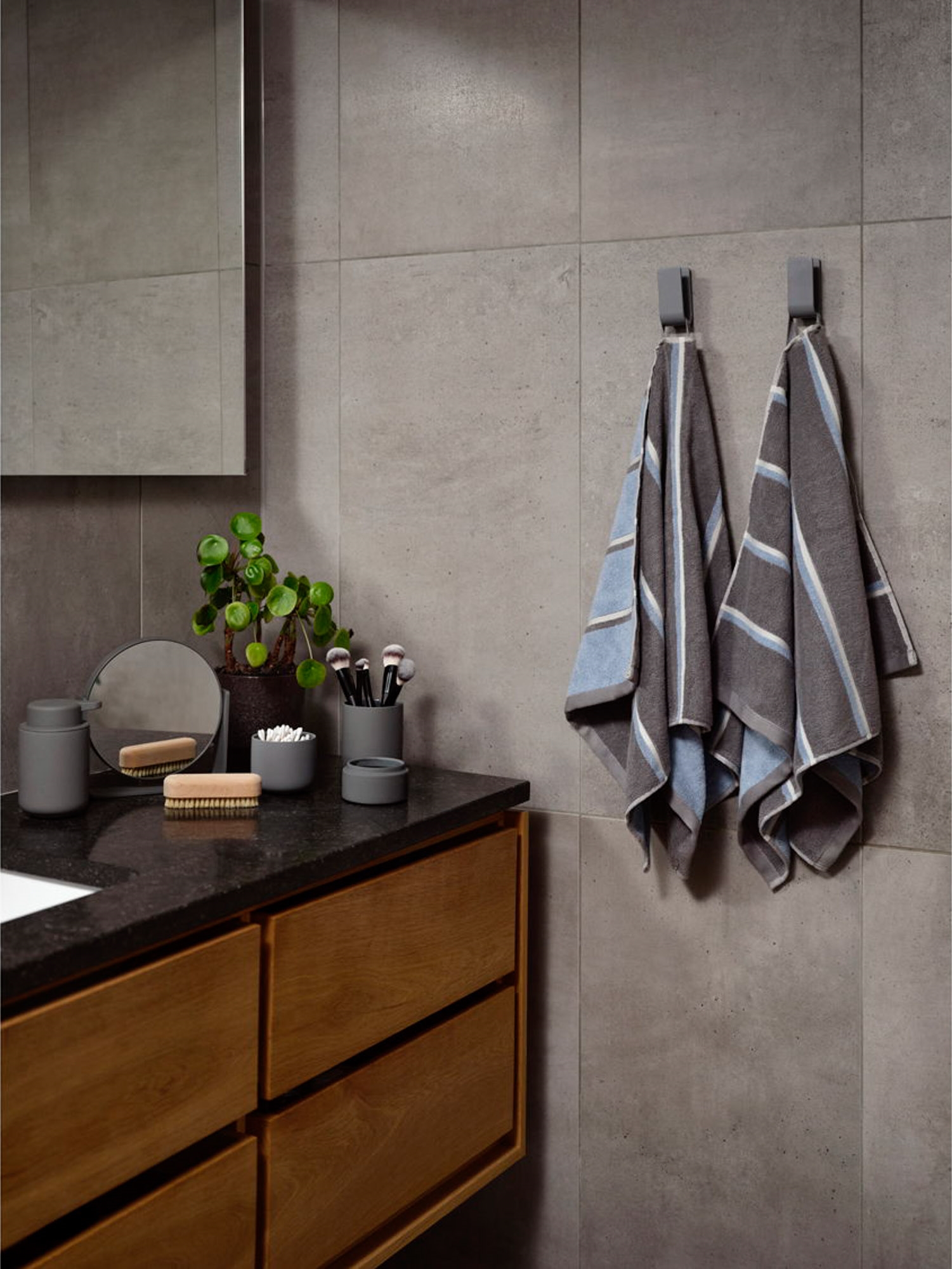 Voorpagina »Oversættelse færdig Grijze handdoek - 50x100 cm - Zone Denmark Zone Scherpe prijs:20,49EUR Op voorraad Aantal In winkelwagen Bekijk meer van:Zone Artikelnr:37620-3 Bekijk ons grote assortiment badmatten voor de vloer Bekijk ons assortiment handdoekensets Bekijk ons grote assortiment badjassen voor het hele gezin Heb je vragen over het product? Type: HanddoekAfmeting: 50x100 cmKleur: GrijsMateriaal: 100% katoen/600 gWassen: 60°CDrogen: Ja Certificering: STANDARD 100 by OEKO-TEX® (2668CIT CITEVE) Sauna is de naam – en de strepen spreken voor zich. De serie is geïnspireerd op de strakke lijnen van een klassieke houten sauna, waar het ontwerp op elegante wijze speelt met perspectief en kleurbalans. Elke zijde van de handdoek benadrukt zijn eigen dominante kleur - een fijn detail dat je twee verschillende looks geeft in één en dezelfde handdoekDe retro-geïnspireerde strepen geven een grafische, urbane touch, en met een zachte, stevige kwaliteit in garengeverfd 600 g katoen voelt de handdoek net zo fijn als hij eruitziet.Kies uit 50 x 100 en 70 x 140 cm – en laat Sauna zijn grafische, kleurrijke stempel op je badkamer zetten. Terug naar Oversættelse færdig