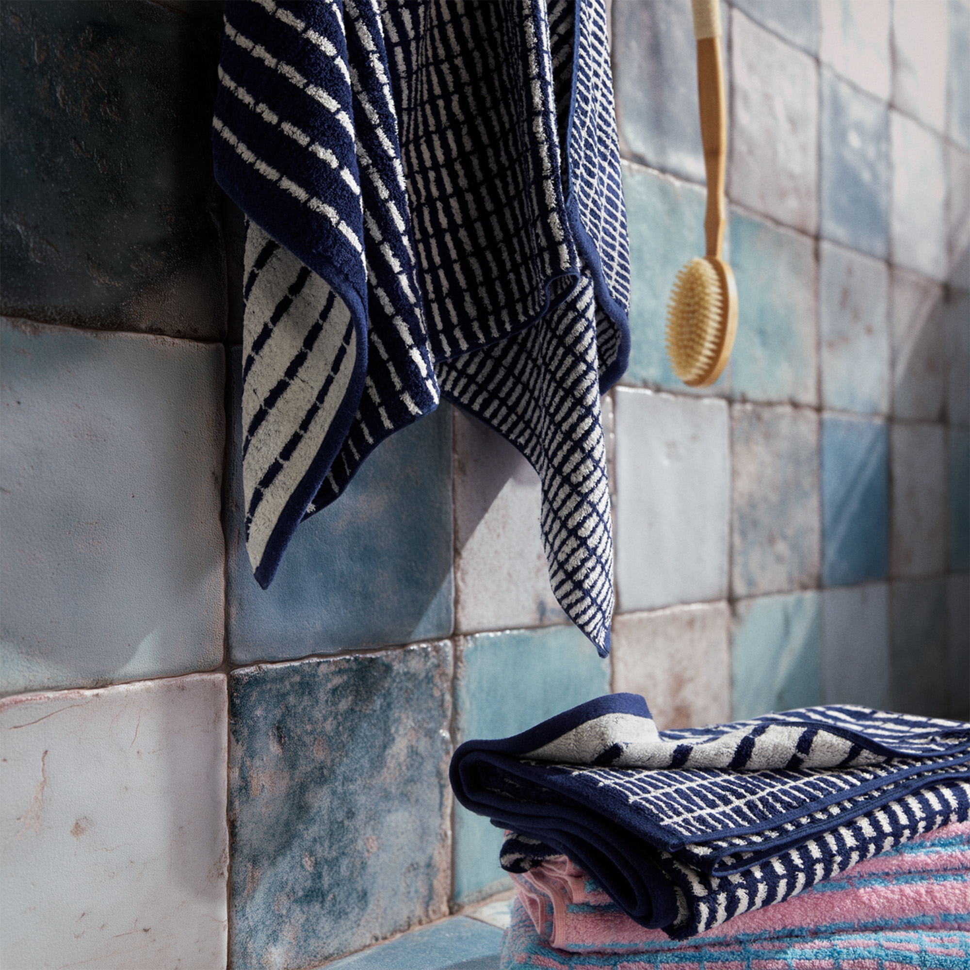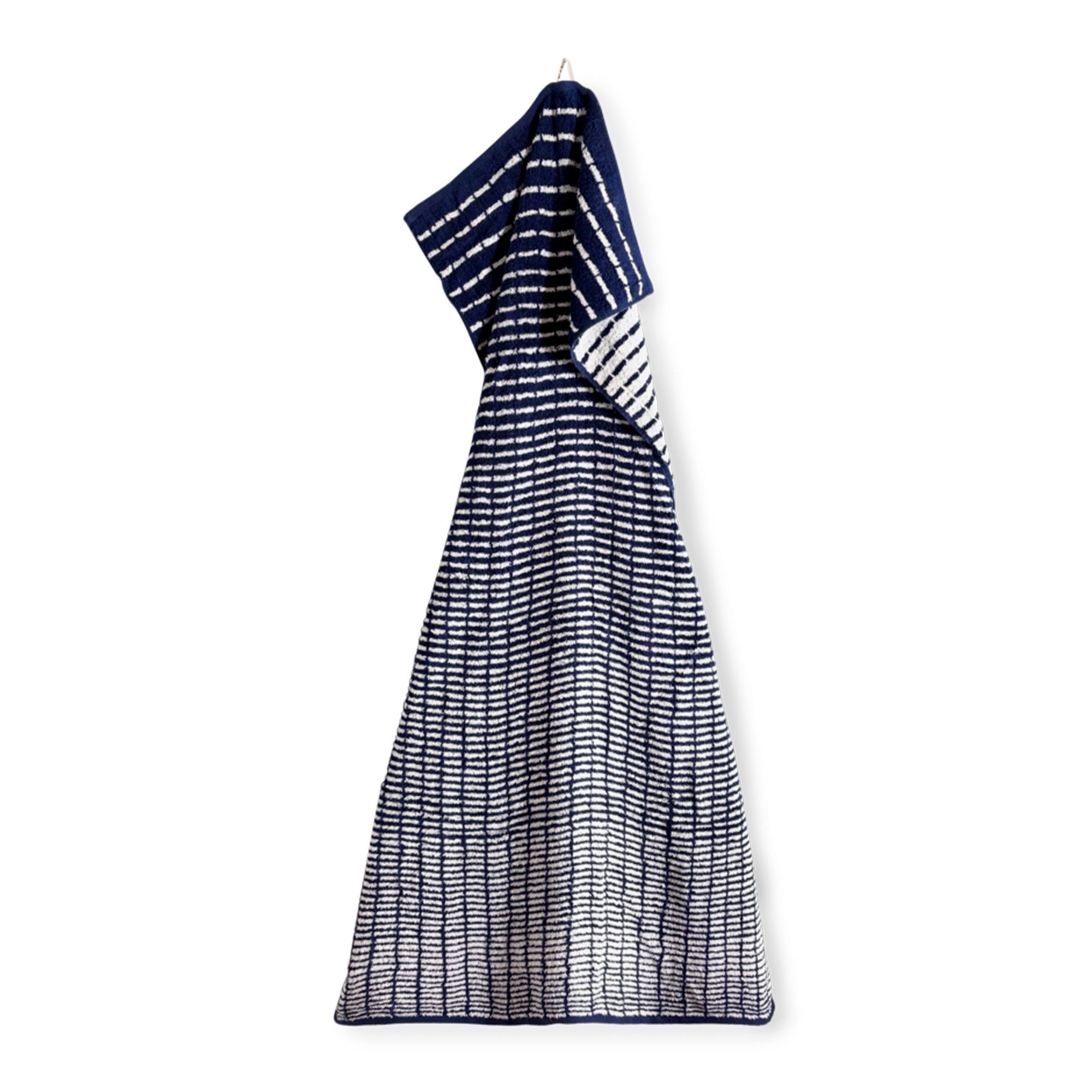 De fijne weving gecombineerd met het elegante patroon in blauw/wit creëert een strak en rustig uiterlijk dat in elke moderne badkamer past. De handdoek ziet er niet alleen mooi uit, maar heeft ook een hoog absorptievermogen en snelle droging, zodat u altijd een frisse handdoek bij de hand heeft.