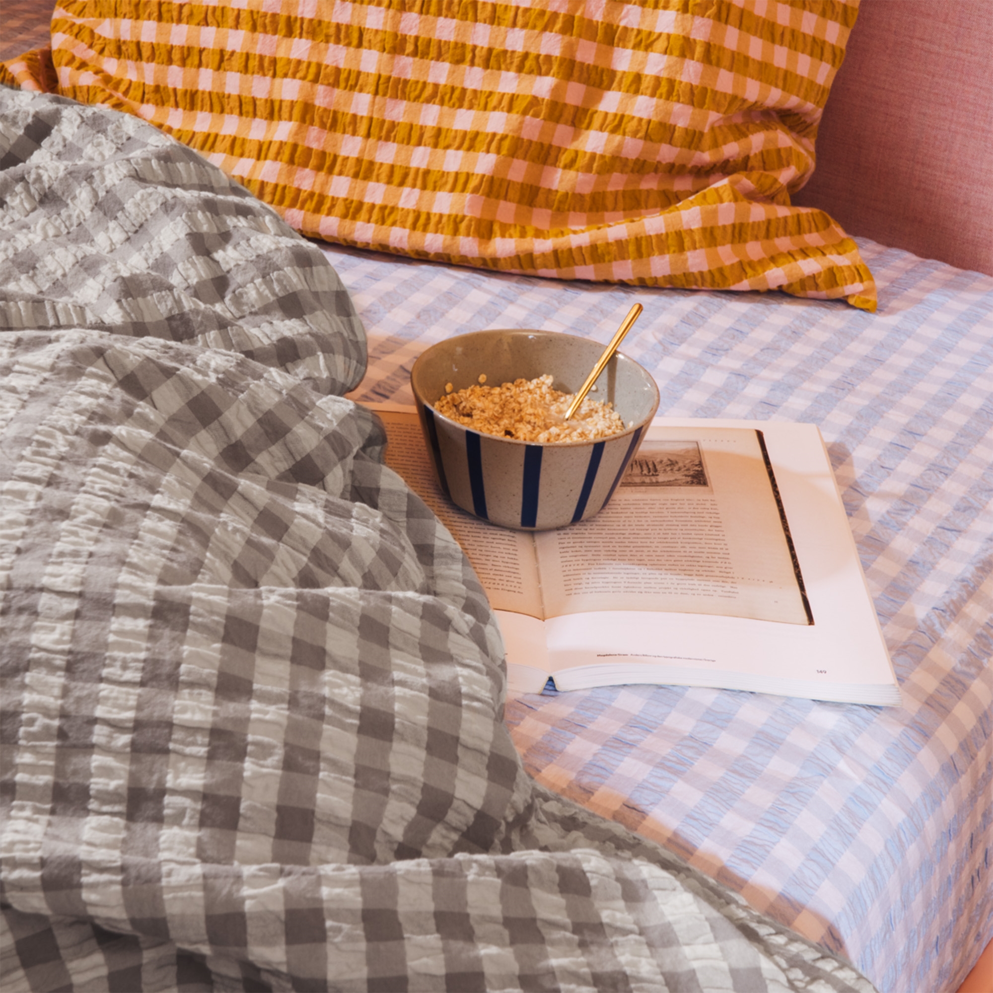 Het zachte katoen gecombineerd met de gekreukte structuur geeft een unieke luxe gevoel. Tegelijkertijd is het beddengoed praktisch in het dagelijks gebruik, omdat het geen strijken vereist en zijn mooie uitstraling behoudt was na was. De fijne ruitjes in grijs en berk geven een rustig en stijlvol uiterlijk dat past in zowel moderne als klassieke slaapkamers.