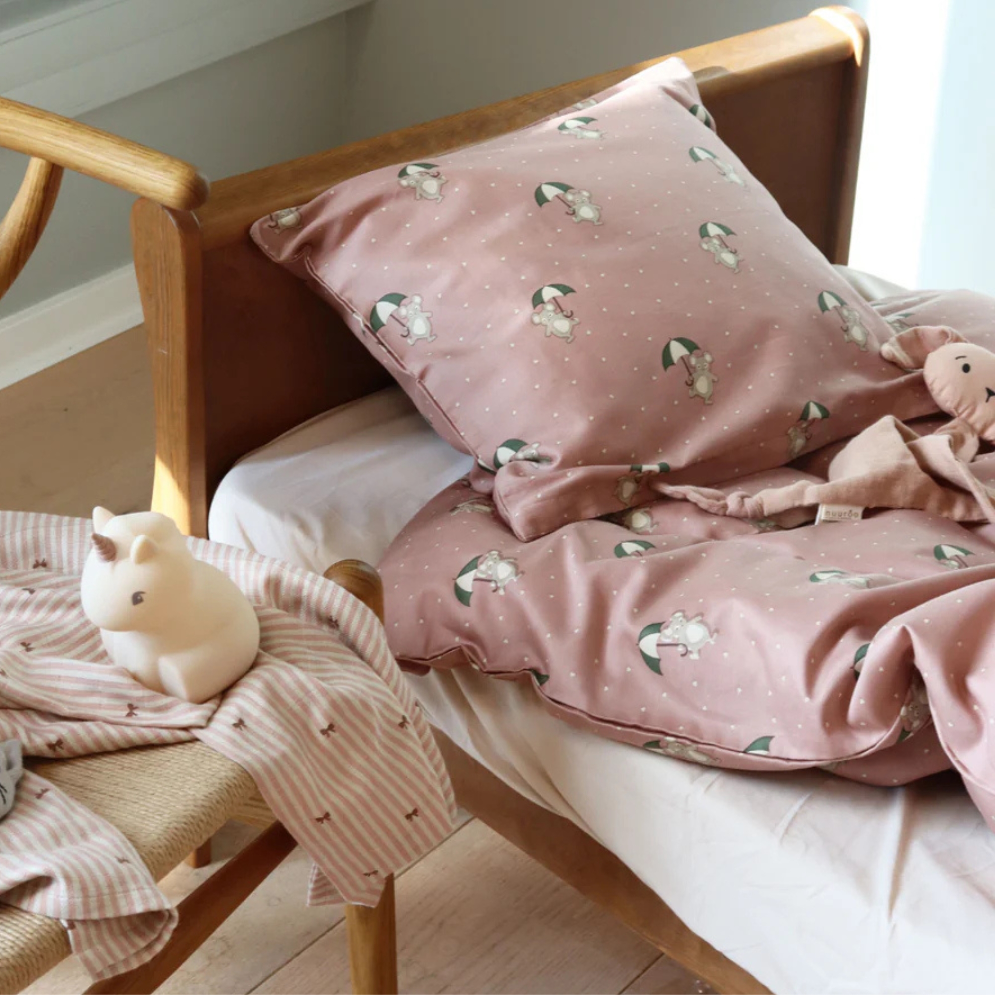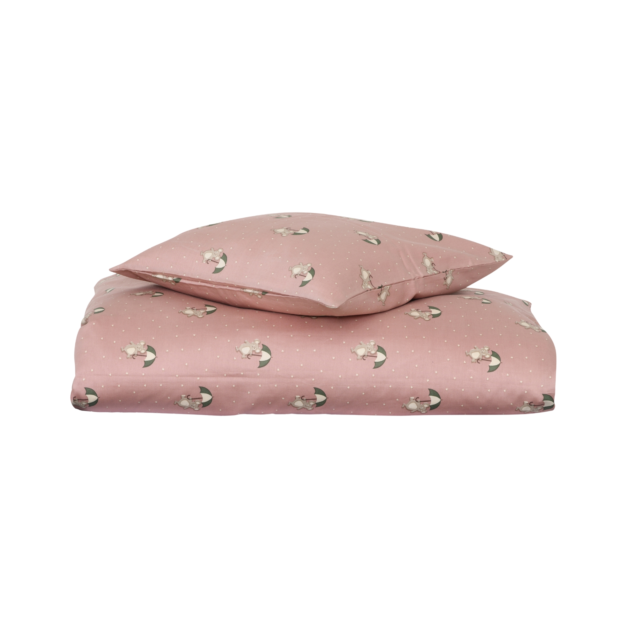 Dit lieve junior dekbedovertrek heeft een gezellig ontwerp met kleine muizen die parapluën vasthouden. De zachte roze achtergrond gecombineerd met de fijne details zorgt voor een warm en rustig geheel, perfect voor een knusse kinderkamer.