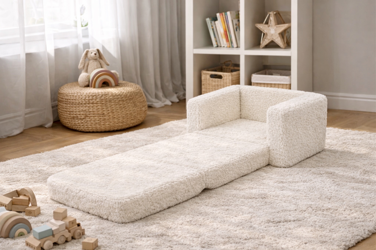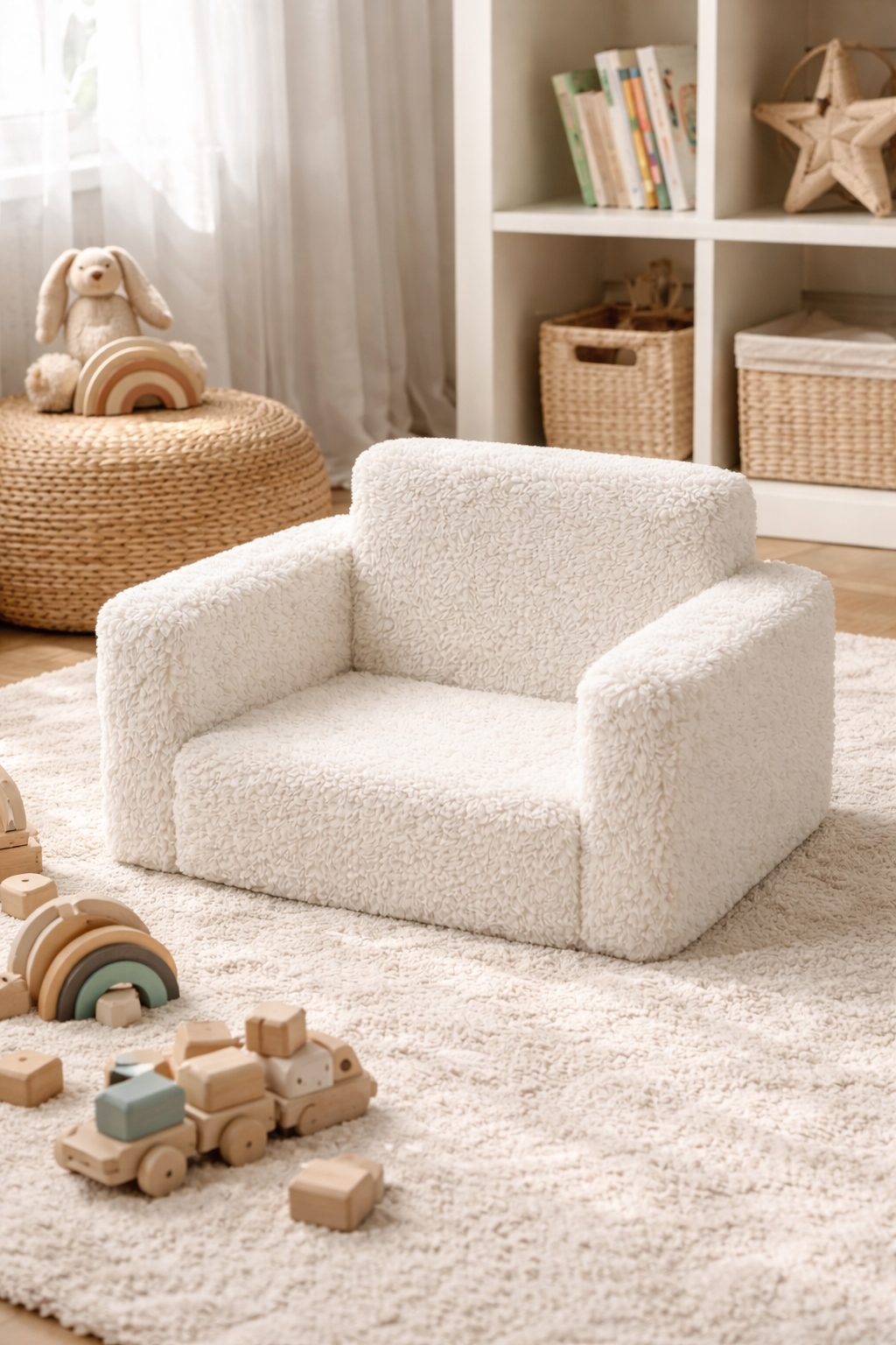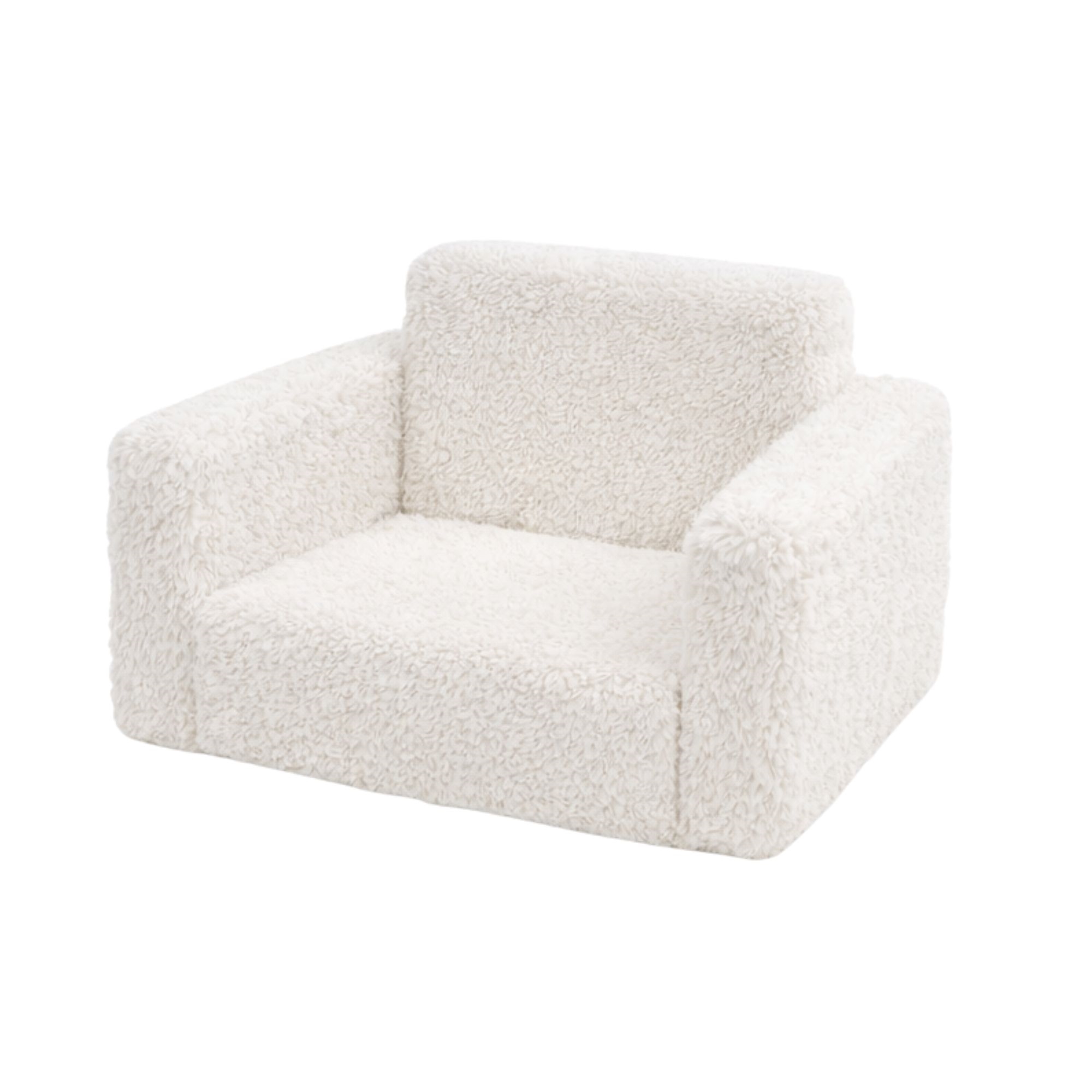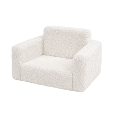 Het neutrale witte plucheontwerp geeft de stoel een Noordse en tijdloze uitstraling die natuurlijk past in moderne interieurs - zowel in de kinderkamer als in de woonkamer.