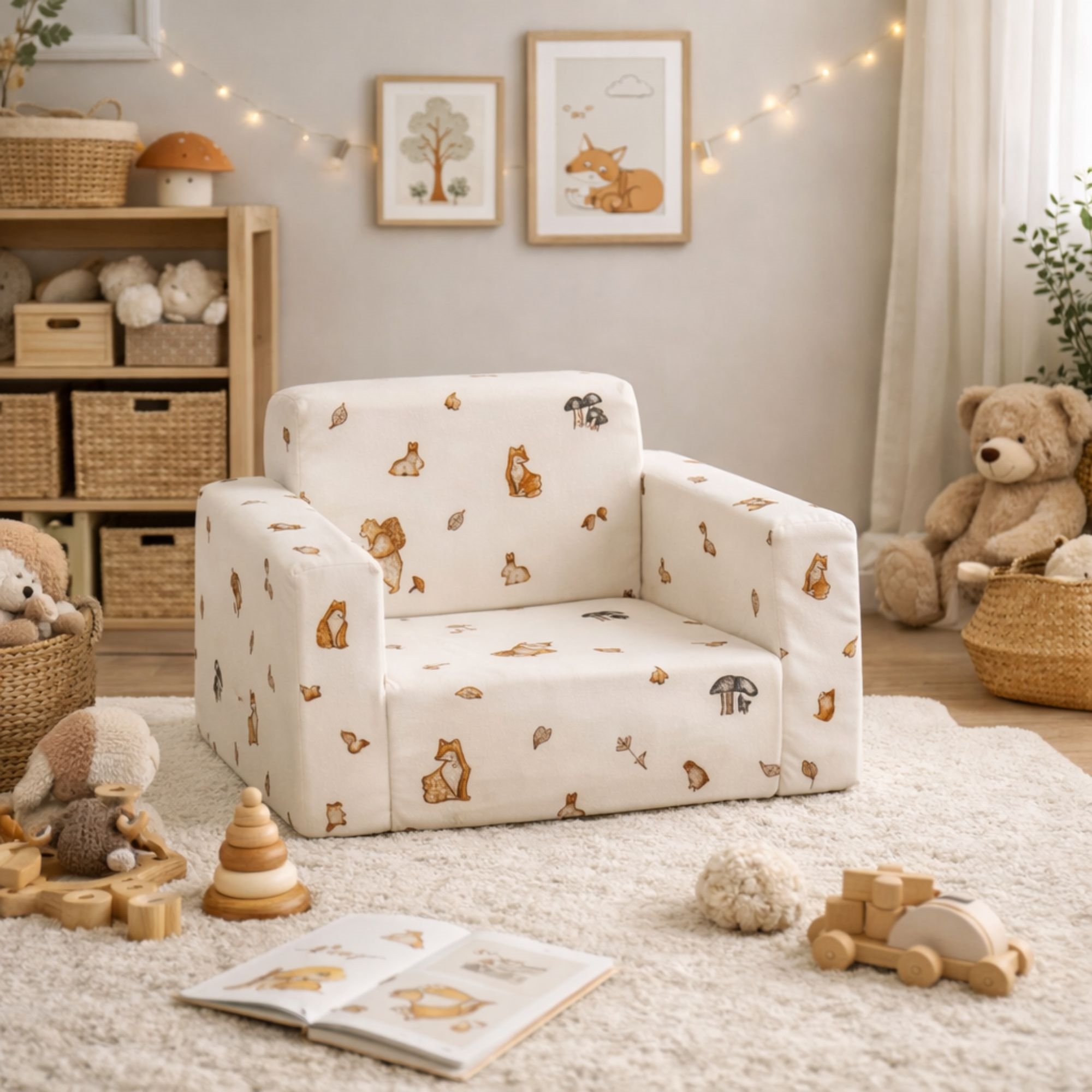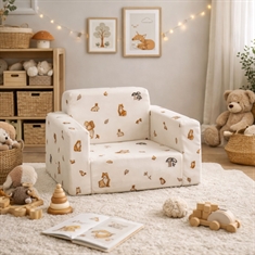 De opvouwbare kinderstoel is vervaardigd met een zachte polyesterbekleding en stabiele schuimvulling, die goede ondersteuning biedt en hem comfortabel maakt om in te zitten. De lichte constructie zorgt ervoor dat het kind de stoel gemakkelijk zelf kan verplaatsen - of het nu als leeshoek, tv-stoel of gezellige kinderstoel wordt gebruikt.