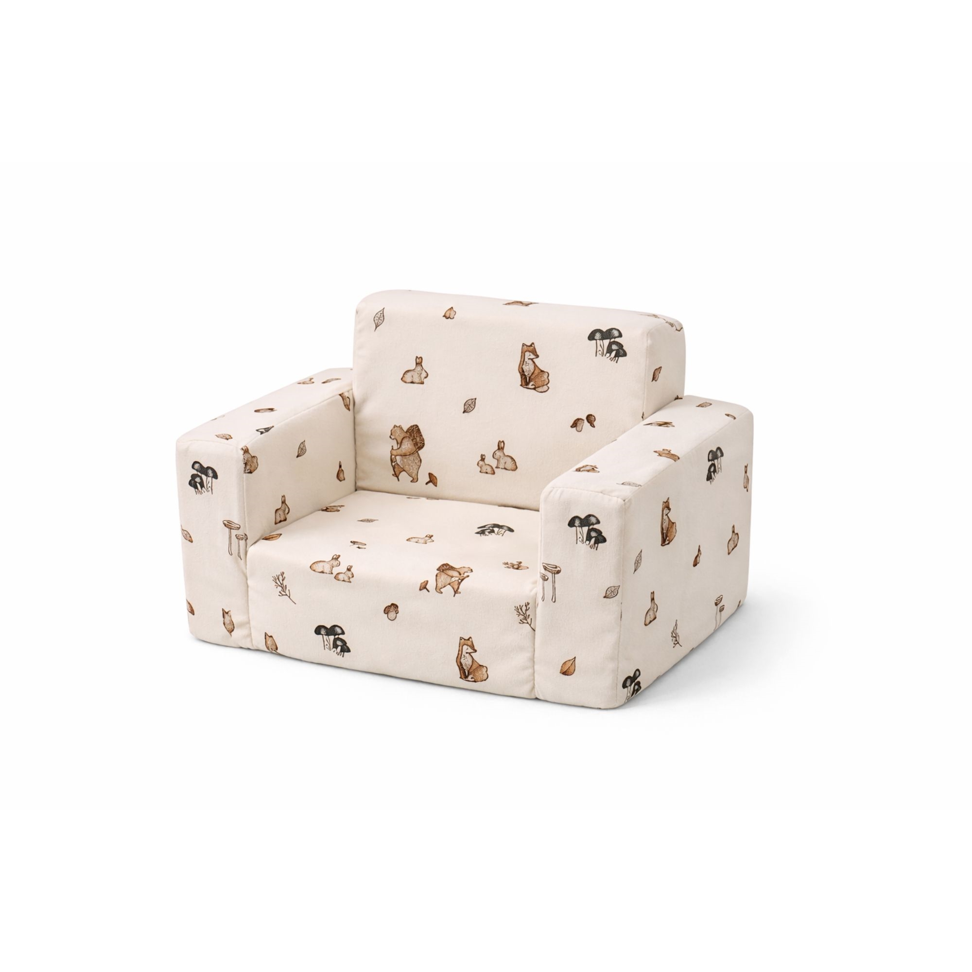 Het ontwerp met vriendelijke motieven van bosdieren in een rustige zandkleur geeft de stoel een nordische en tijdloze uitstraling die natuurlijk past in moderne interieurs.