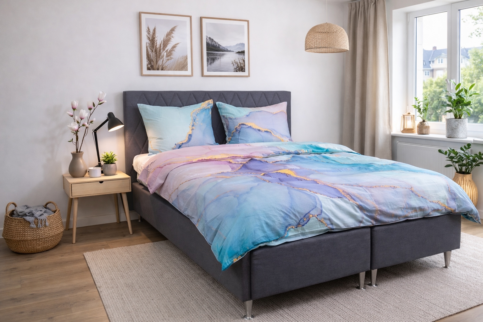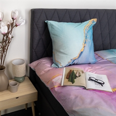 Geef de slaapkamer een elegant en modern karakter met deze katoensatijnen kussensloop in blauw en roze marmerlook. De gedetailleerde marmer digitale print creëert een exclusieve, bijna 3D-achtige diepte in het design, waarbij de fijne gouden lijnen en zachte kleurverlopen een verfijnde en artistieke uitstraling geven.