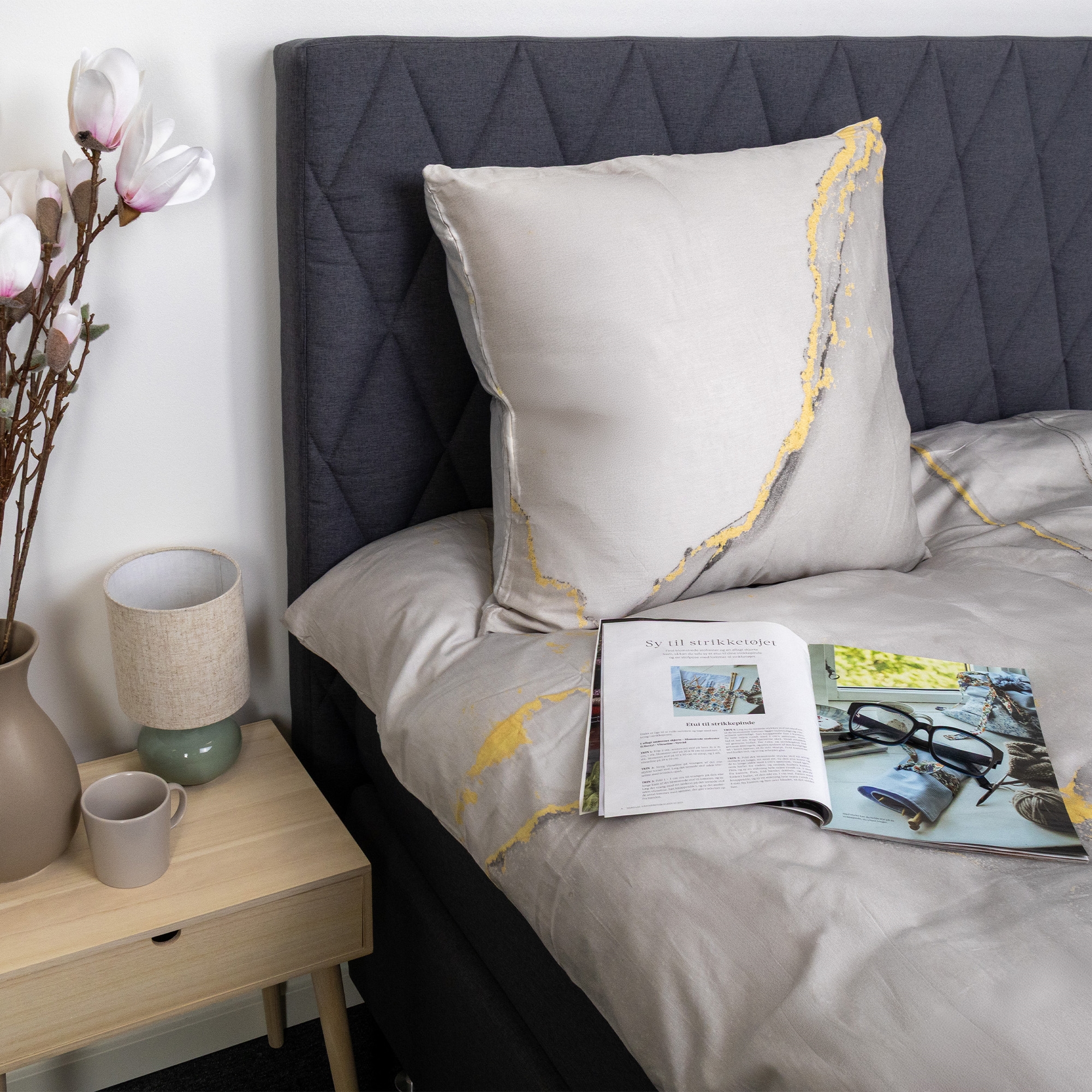 Geef de slaapkamer een elegante en moderne uitstraling met deze katoensatijn kussensloop in grijs marmerlook. De gedetailleerde marmer digitale print creëert een exclusieve, 3D-achtige diepte in het ontwerp, waarbij de fijne gouden lijnen en zachte kleurverlopen een verfijnde en artistieke look geven.
