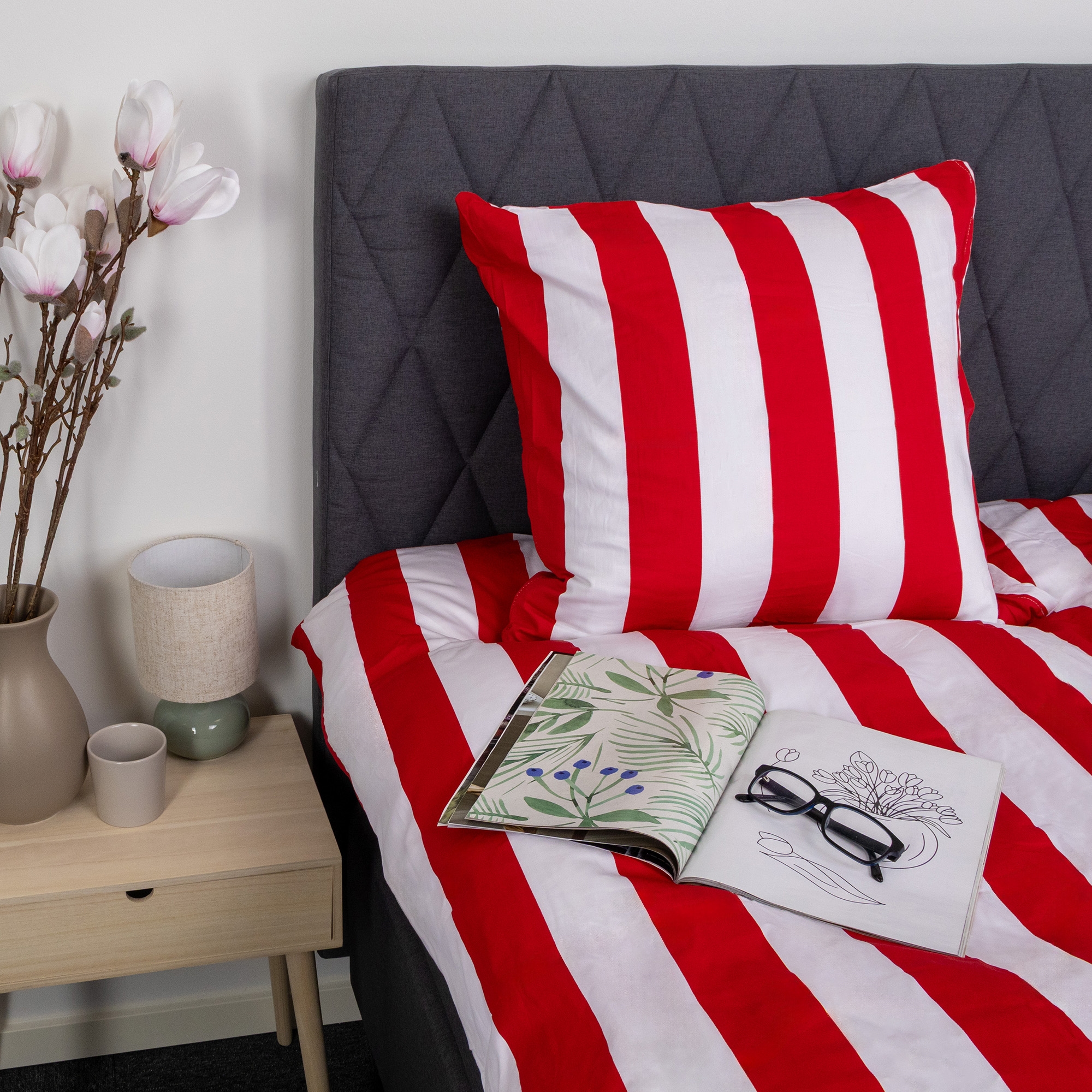 Creëer een strak en harmonieus geheel in de slaapkamer met deze rood-wit gestreepte kussensloop van 100% katoensatijn. Het brede Nordic Stripe-design geeft een rustig en modern voorkomen met een vleugje klassieke Scandinavische stijl - perfect voor wie zowel comfort als een mooie en uitnodigende slaapkamer wil.