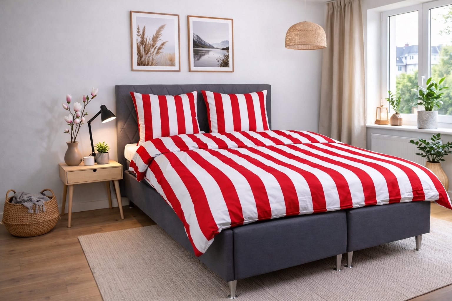 De brede gestreepte print geeft een scherp en harmonieus uiterlijk. De combinatie van rode en witte strepen zorgt voor een ontspannen en rustig effect in de slaapkamer, terwijl het ontwerp gemakkelijk te combineren is met verschillende kussens.