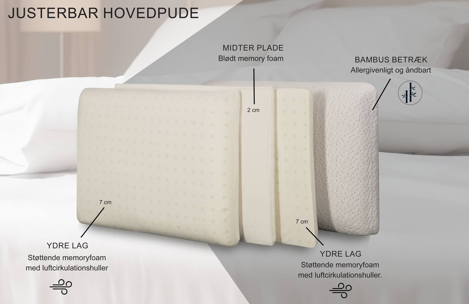 Voorpagina »Hoofdkussens » Type kussen » Ergonomisch kussen Memory foam kussen - Verstelbaar hoofdkussen met 3 lagen - Zen Sleep Gorm - Hoogteregulerend nekkussen Bespaar69% Zen Sleep 176,9954,49EURSpar 123,- Op voorraad Aantal In winkelwagen Bekijk meer van:Zen Sleep Artikelnr:Zen928 Lees onze kussengids Lees meer over het onderhoud van dekbedden en kussens Bekijk ons grote assortiment kussenslopen Heb je vragen over het product? Het persoonlijke hoofdkussen.Hoogteregulerend kussen.Zen Sleep - Gorm Grootte: 60x40x14 cm (past op standaard kussensloop) Type: kussen van memory foam met 3 verstelbare lagen Constructie: 3 lagen/kernen van memory foam Merk: Zen Sleep - Gorm Vulling: memory foam Hoes: 40% bamboe en 60% polyester - met een elegante zilverkleurige bies Wassen: 30° delicate cyclus (alleen de hoes mag gewassen worden) Drogen in de droger: Nee Certificering: STANDARD 100 by OEKO-TEX® (18) HCN. 42834) Gorm - Het persoonlijke kussen van het Deense merk Zen Sleep. "Het persoonlijke kussen" bestaat uit 3 lagen memory foam. De 3 schuimlagen kunnen zo gecombineerd worden dat het kussen precies de juiste structuur krijgt die bij jou past. De twee buitenste lagen zijn gevormd naar de natuurlijke lijnen van de nek, terwijl de binnenste kern platter is. Door één of meerdere schuimlagen te verwijderen, pas je de hoogte van het kussen aan. Zodra je het kussen hebt aangepast, merk je snel dat het drukverlagende memory foam de drukpunten van je nek en hoofd ondersteunt. Dit zorgt voor een ergonomisch correcte slaaphouding. Zodra je de juiste slaaphouding hebt gevonden, zul je merken dat je lichaam beter ontspant, wat helpt bij het verlichten van pijn en spanning in je nek en schouders. Het kussen is bedekt met een antibacteriële, hypoallergene en zachte bamboehoes. Bekijk hier onze grote selectie beddengoed in 140x200 cm Zen Sleep is een Deens merk dat sinds 2012 woontextiel produceert. Zen Sleep's producten stralen kwaliteit en comfort uit. In het ruime assortiment vind je onder andere dekbedden, kussens, topmatrassen en matrasbeschermers. Zen Sleep gebruikt hoogwaardige grondstoffen om de deur te openen naar een veilige en welvarende nachtrust. Zen Sleep zelf zegt: "Met de consument centraal, worden alleen de beste producten gemaakt". Terug naar Ergonomisch kussen