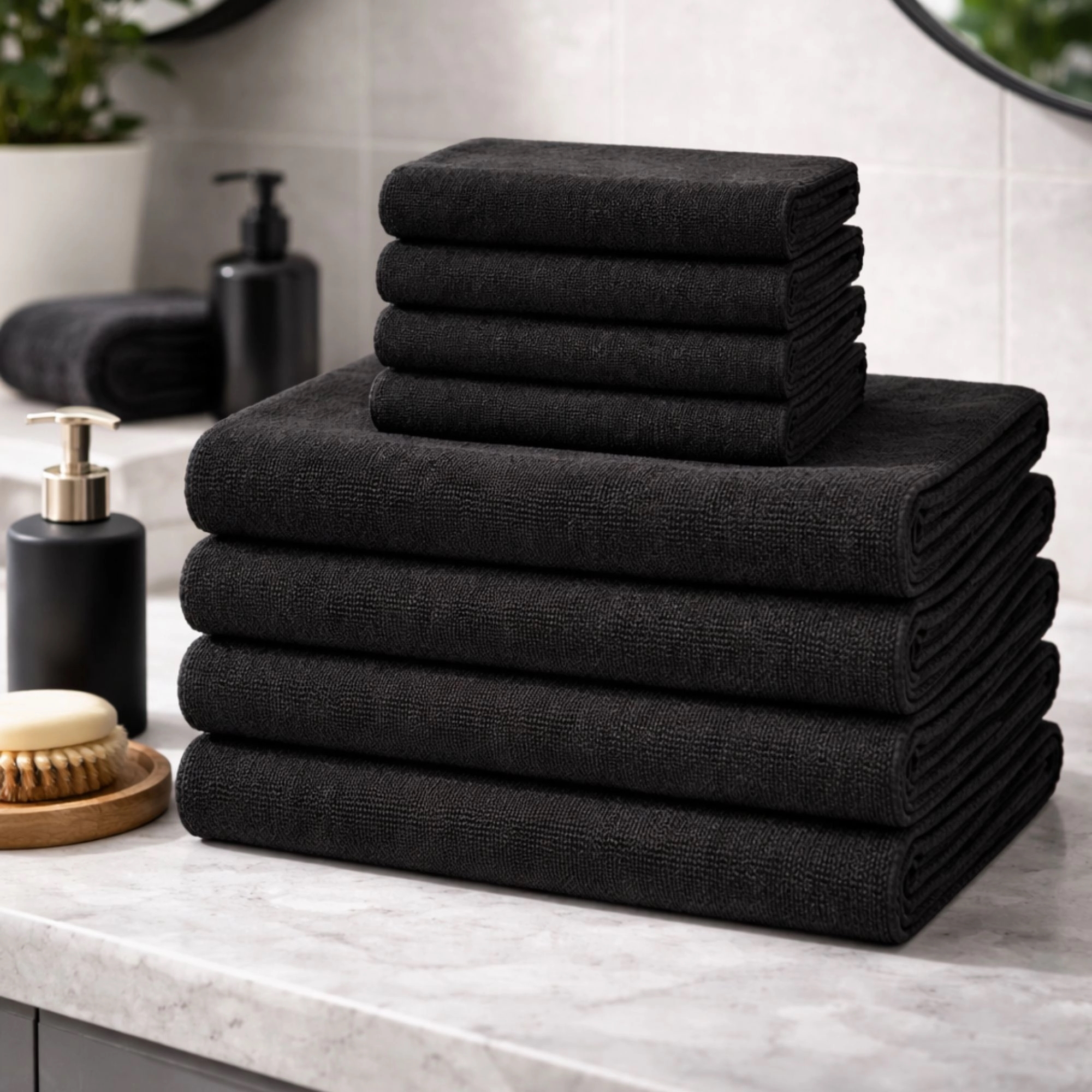 Voorkom zware en langzaam drogende handdoeken - met deze zwarte microvezelhanddoeken krijg je een lichte en praktische oplossing die perfect past bij een actieve levensstijl. De zachte microvezel voelt aangenaam op de huid en neemt effectief vocht op, zodat je snel droog bent - of je nu in de sportschool, het zwembad of onderweg bent. De handdoeken drogen snel en nemen weinig ruimte in, wat ze ideaal maakt voor zowel je sporttas als je koffer. Perfect voor wie functionaliteit wil zonder concessies te doen aan comfort. De ademende kwaliteit voorkomt vocht en geur, zodat de handdoeken keer op keer fris aanvoelen. Een slimme en hygiënische keuze voor training, reizen en dagelijks gebruik. In deze 8-pack krijg je 4 handdoeken van 70x140 cm en 4 stuks van 50x100 cm.
