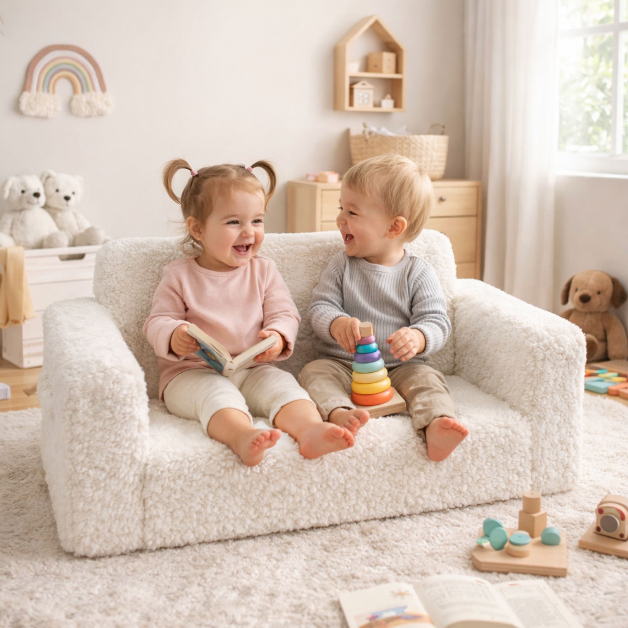 Een opvouwbare bank voor kinderen zoals deze combineert comfort, spel en functionaliteit in één meubelstuk en wordt al snel een natuurlijk verzamelpunt in de kinderkamer.