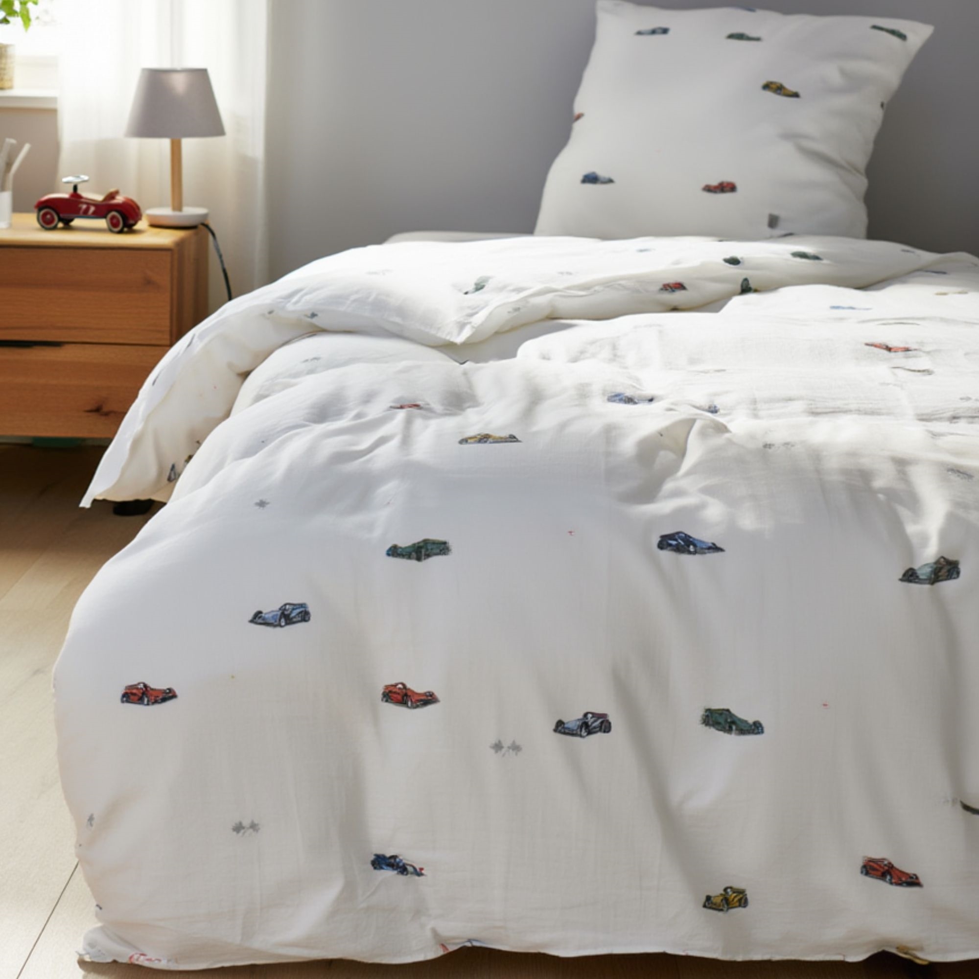 Creëer een lichte en rustige sfeer in de kinderkamer met dit mooie juniorbeddengoed van By Mats in een witte tint met kleine, decoratieve raceauto's. Het eenvoudige en noordse ontwerp geeft een zacht en harmonieus uiterlijk dat mooi past in zowel moderne als klassieke interieurs.