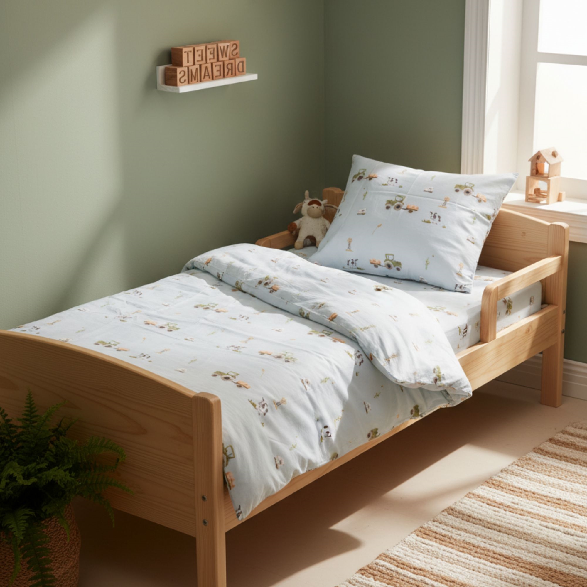 Het beddengoed is vervaardigd van 100% zacht katoen, dat ademend is en mild voor de kwetsbare huid van de baby. De natuurlijke eigenschappen van katoen helpen de temperatuur gedurende de nacht te reguleren, zodat je baby een veilige, comfortabele en rustige slaap krijgt – het hele jaar door.