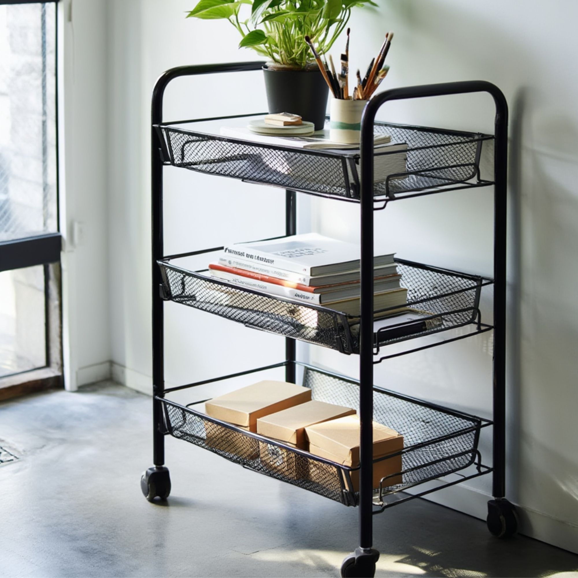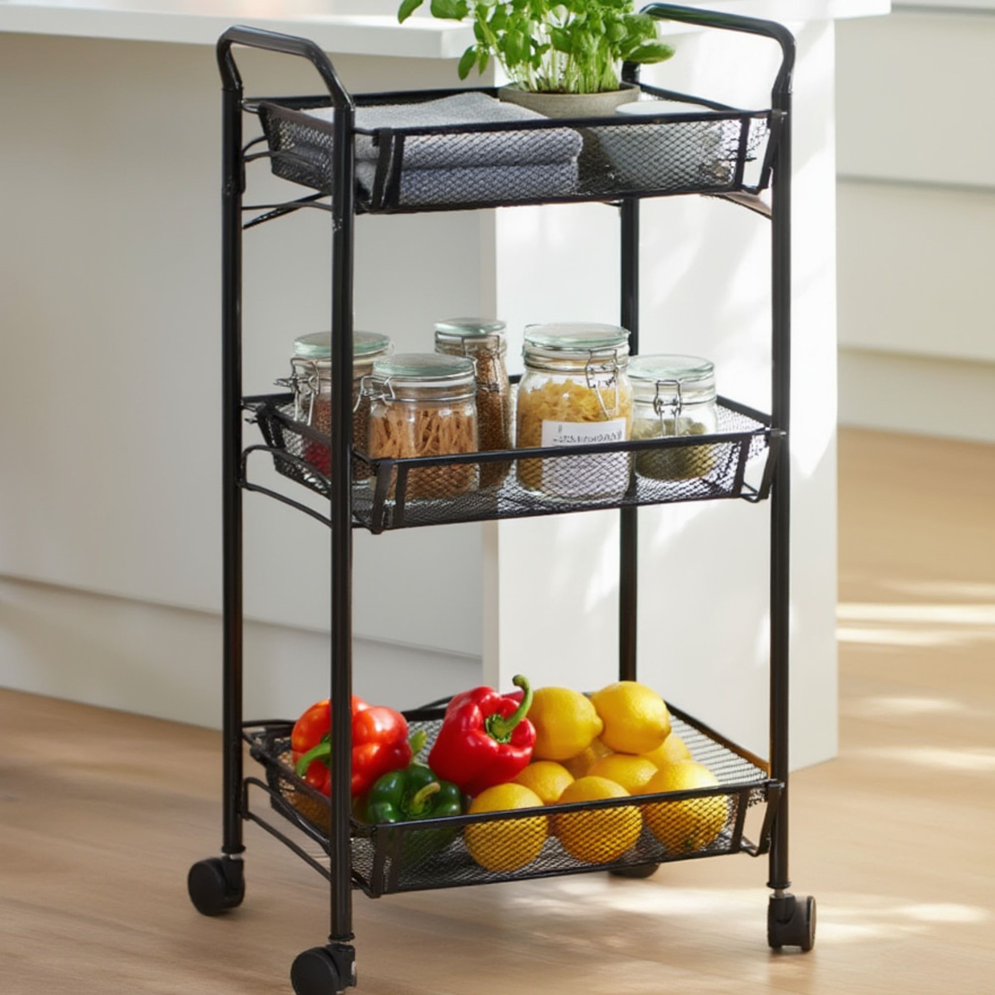 Voorpagina »Inrichting » Voor aan tafel » Keuken Trolley met 3 uitneembare manden - 64x45x26 cm - Zwart metalen trolley op wieltjes Bespaar56% HOME-TEX 40,9917,99EURBespaar 23,- Op voorraad Aantal In winkelwagen Bekijk meer van:HOME-TEX Artikelnr:PR791 Heb je vragen over het product? Robuuste metalen trolleyDrie afneembare mandenZwenkwielen met blokkeerfunctie Materiaal: Metaal Afmetingen: 64x45x26 cm Kleur: Zwart Wielen: Zwenkwielen met blokkeerfunctie Opbergwagen: Praktisch en stijlvol opbergen op wielen Deze opbergwagen is zowel praktisch als stijlvol ontworpen. Hij is gemaakt van robuust zwart metaal en heeft drie uitneembare manden waarmee je je spullen gemakkelijk kunt ordenen. De wagen is voorzien van vier draaibare wieltjes van kunststof die hem gemakkelijk verplaatsbaar maken. Twee van de wieltjes hebben een blokkeerfunctie die ervoor zorgt dat de trolley stabiel staat wanneer hij geparkeerd is. Details Afmetingen: 64x45x26 cm Kleur: zwart Materiaal: metaal Metaal Metaal is een zeer duurzaam materiaal met een lange levensduur. Het is ook gemakkelijk schoon te maken en te onderhouden, wat het een ideale keuze maakt voor opbergmeubels zoals deze trolley. Dankzij zijn zwarte kleur voegt het metaal ook een stijlvol en modern tintje toe aan je interieur. Afneembare manden De drie afneembare manden maken het eenvoudig om je spullen te ordenen. Je kunt ze bijvoorbeeld gebruiken om je spullen in categorieën te verdelen, of je kunt een mand meenemen als je de inhoud ergens anders nodig hebt. Dit maakt de opbergwagen zeer flexibel en veelzijdig in gebruik. Zwenkwielen met blokkeerfunctie Dankzij de draaibare wieltjes van kunststof verplaats je de wagen eenvoudig naar elke gewenste plek. De blokkeerfunctie op twee van de wieltjes zorgt ervoor dat de wagen stabiel geparkeerd staat. Het is een praktisch detail dat de trolley nog handiger maakt. Stel je eens voor hoe eenvoudig het zal zijn om je spullen geordend te houden met deze opbergtrolley. Of je het nu in de keuken, de badkamer, het kantoor of ergens anders gebruikt, het zal je helpen een beter georganiseerd en overzichtelijk huis te creëren. Maak het dagelijks leven makkelijker met praktische opbergen op wielen. We raden je aan ook eens naar de categorie Inrichting te kijken. Terug naar Keuken