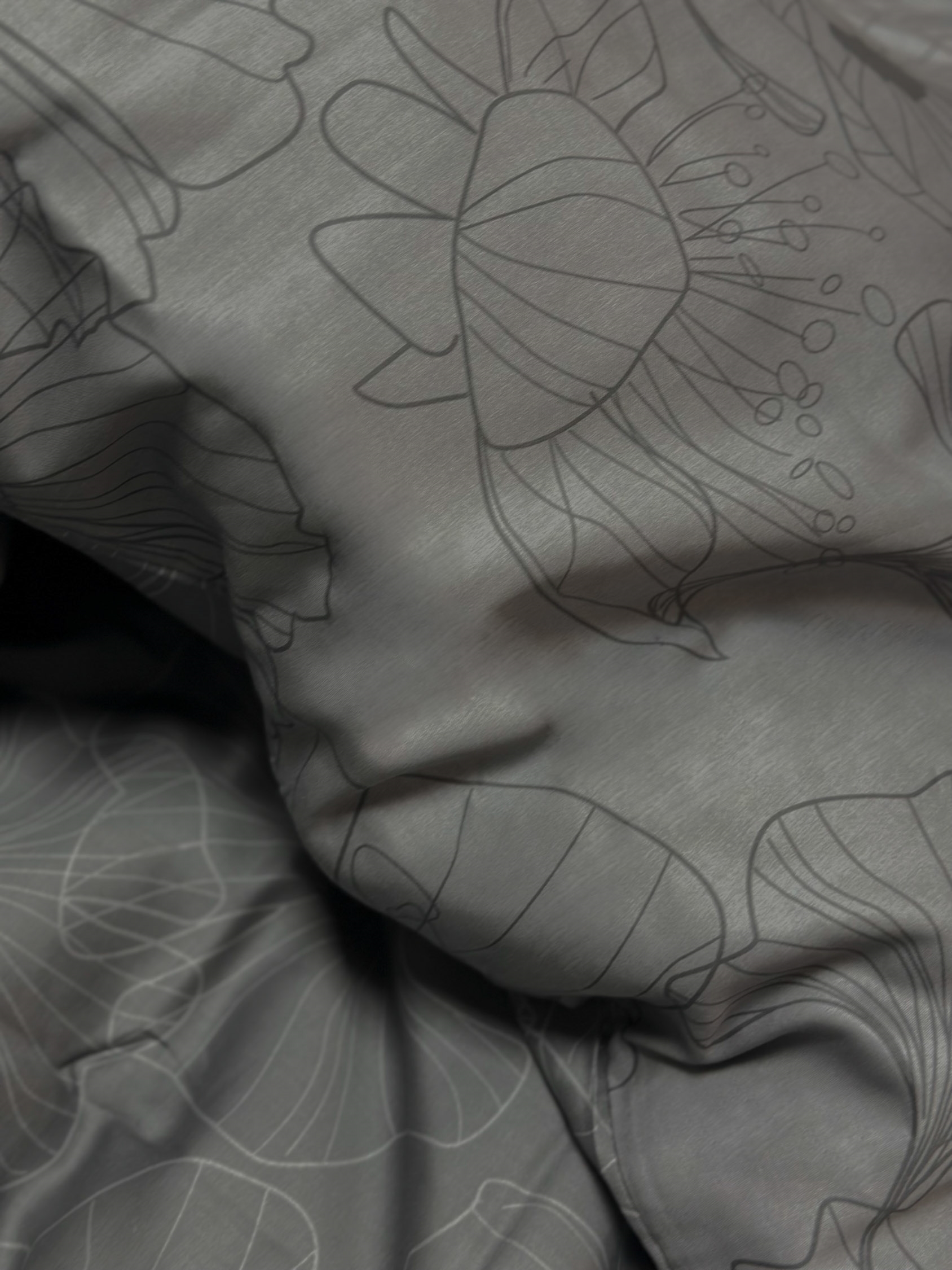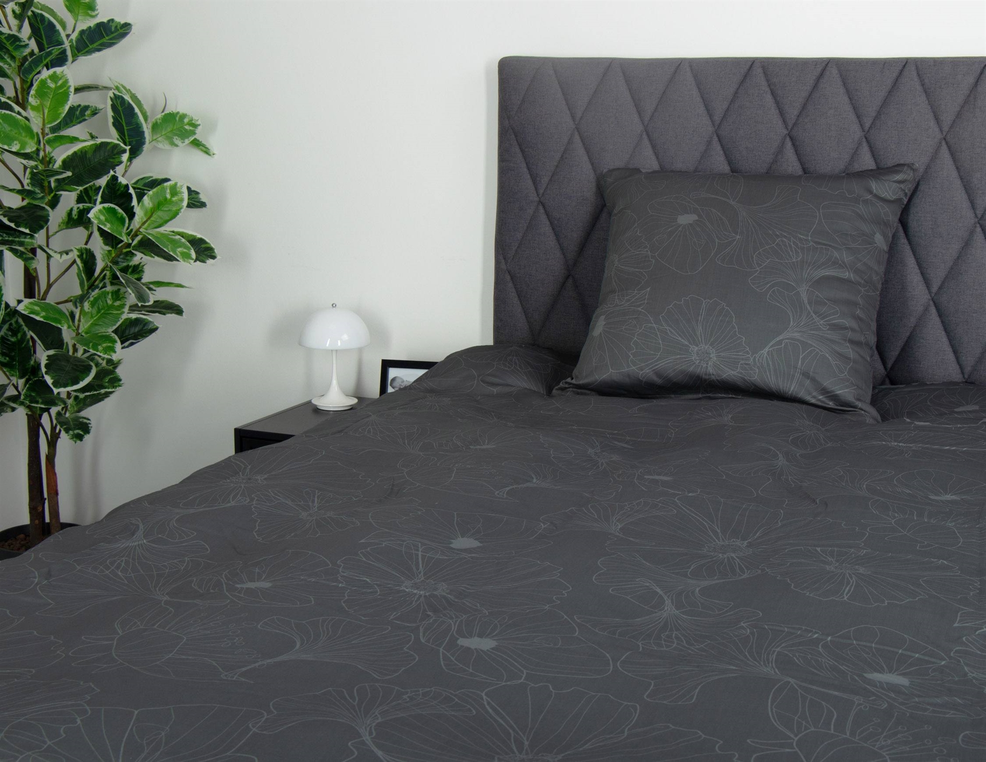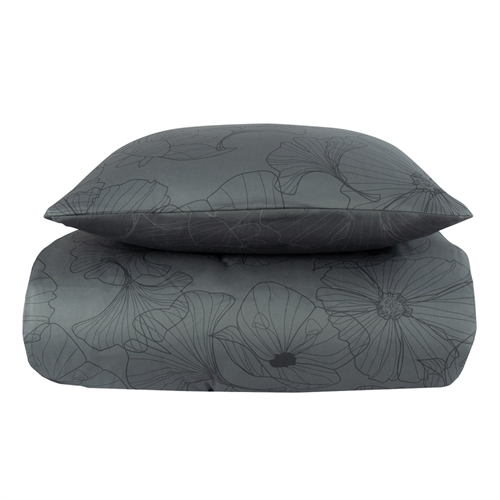Het omkeerbare design geeft je twee verschillende looks in één set. De voorzijde heeft een elegant bloemenprint in lichtgrijze tinten, terwijl de achterzijde donkergrijs is. Hierdoor is het overtrek eenvoudig te combineren met diverse kleuren, kussens en plaids en biedt het meer flexibiliteit in de inrichting.