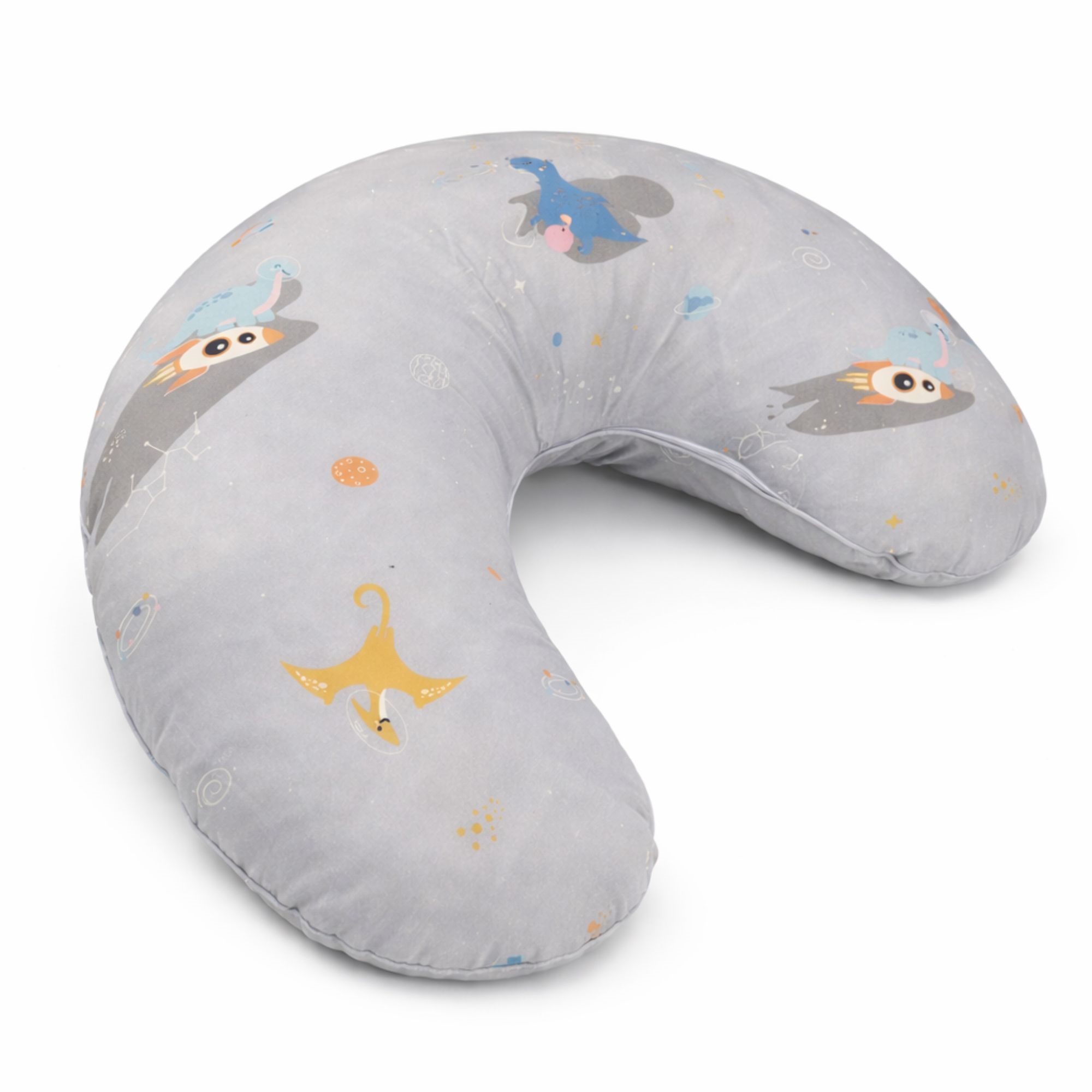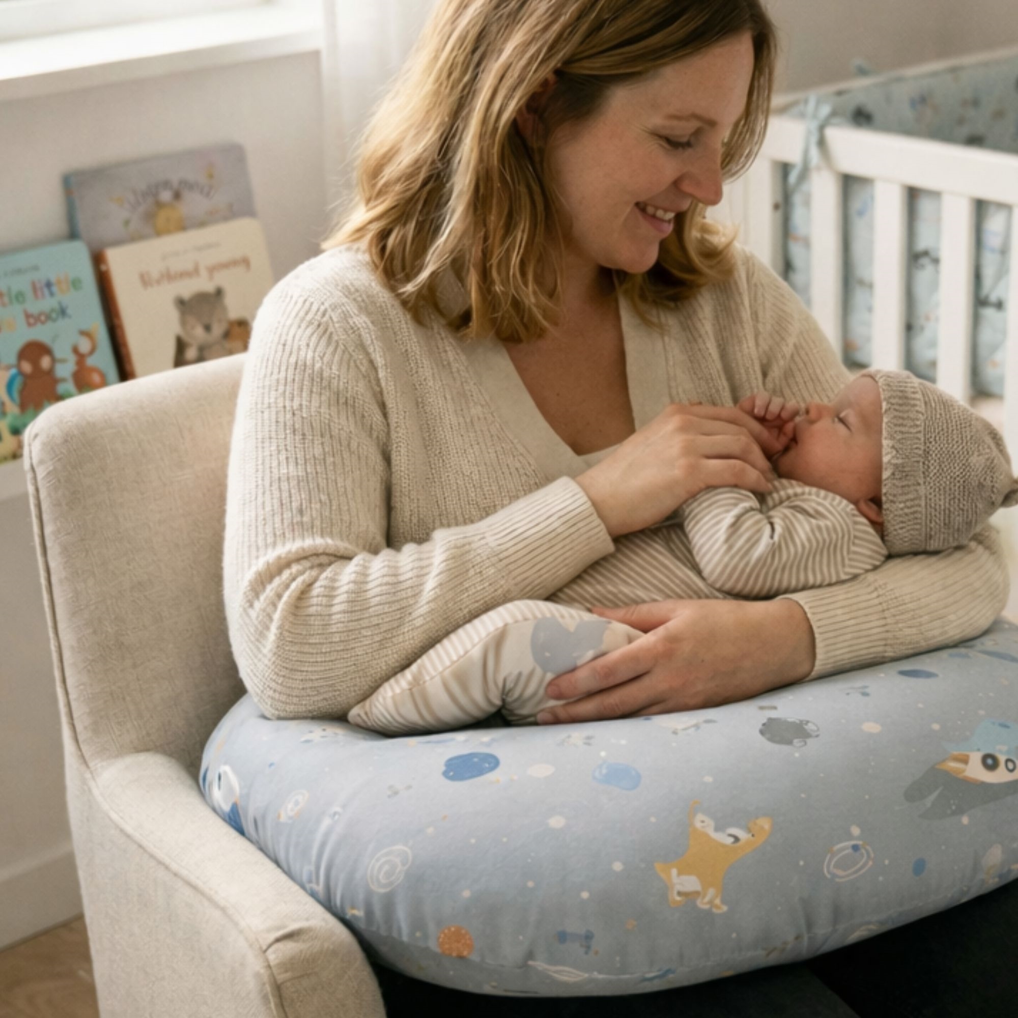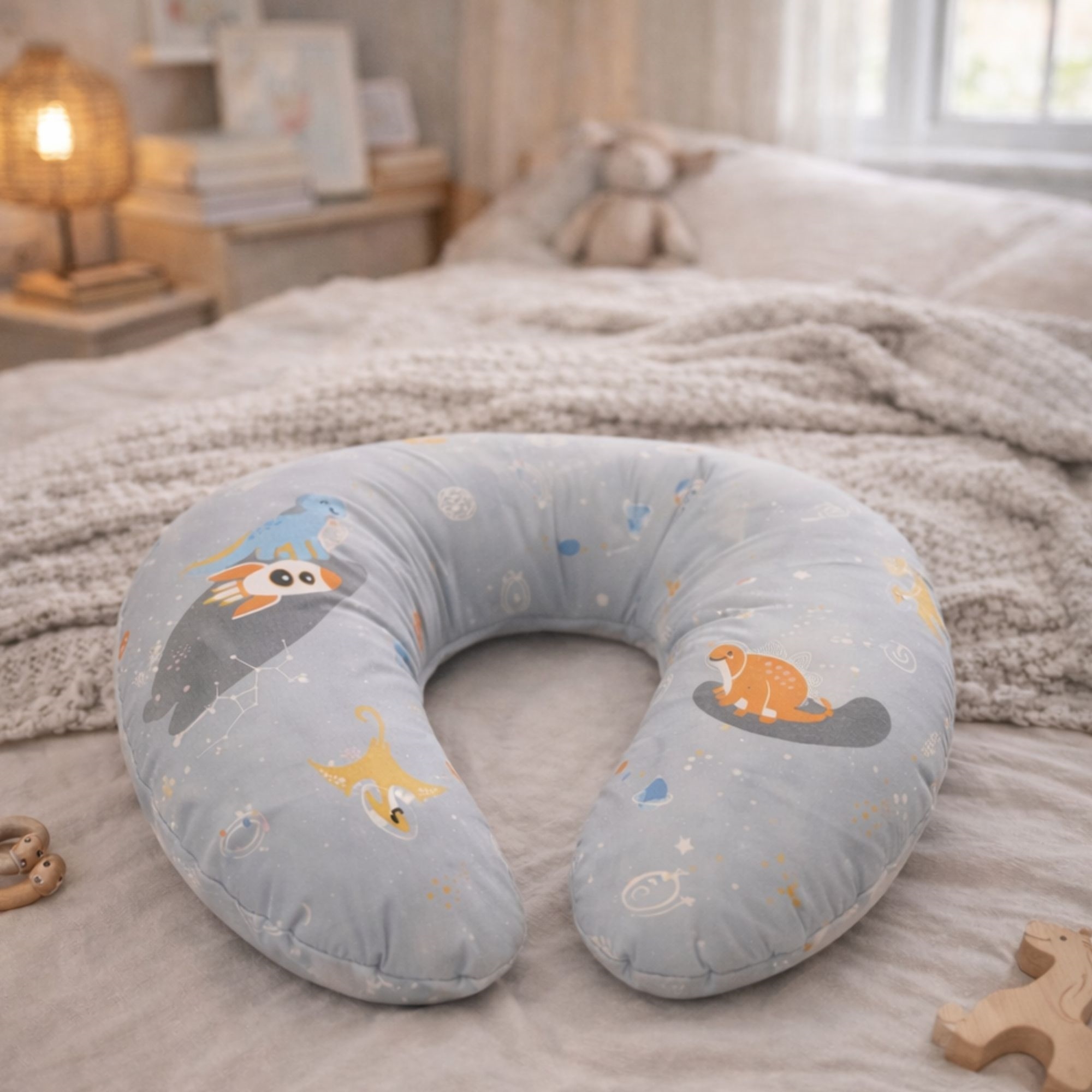 Het voedingskussen meet 73x53x10 cm en biedt veel ruimte en stabiele ondersteuning rondom het lichaam. Het is gevuld met zachte polyestervezelvulling, die zich prettig vormt en helpt armen, schouders, nek en onderrug te ontlasten. Dit creëert een meer ontspannen en correcte voedingshouding - zowel bij borstvoeding als bij flesvoeding.