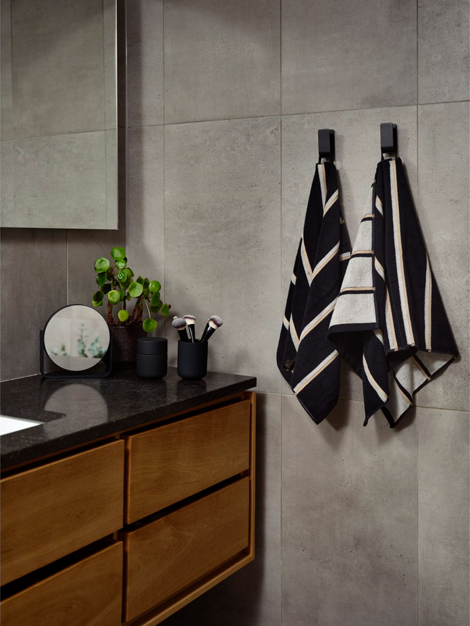 Voorpagina »Oversættelse færdig Zwarte handdoek - 50x100 cm - Zone Denmark Zone Scherpe prijs:20,49EUR Op voorraad Aantal In winkelwagen Bekijk meer van:Zone Artikelnr:37622-3 Bekijk ons grote assortiment badmatten voor op de vloer Bekijk ons assortiment handdoekensets Bekijk ons grote assortiment badjassen voor het hele gezin Heb je vragen over het product? Type: HanddoekAfmeting: 50x100 cmKleur: ZwartMateriaal: 100% katoen/600 gWas: 60°Droogtrommel: Ja Certificering: STANDARD 100 by OEKO-TEX® (2668CIT CITEVE) Sauna is de naam – en de strepen spreken voor zich. De serie is geïnspireerd op de strakke lijnen van een klassiek met hout beklede sauna, waar het design elegant speelt met perspectief en kleurbalans. Elke zijde van de handdoek benadrukt zijn eigen dominante kleur - een fijn detail dat je twee verschillende uitstraalingen in één en dezelfde handdoek geeftDe retro-geïnspireerde strepen voegen een grafisch, stedelijk tintje toe, en met een zachte, stevige kwaliteit in garengeverfde 600 grams katoen voelt de handdoek net zo heerlijk als hij eruitziet.Kies uit 50 x 100 en 70 x 140 cm – en laat Sauna zijn grafische, kleurrijke stempel op je badkamer zetten. Terug naar Oversættelse færdig